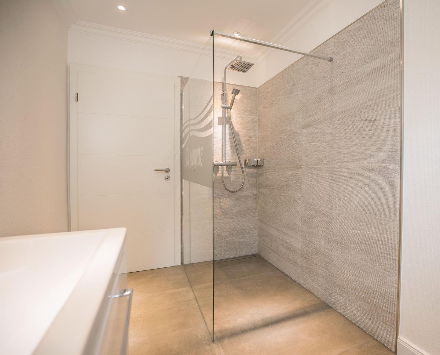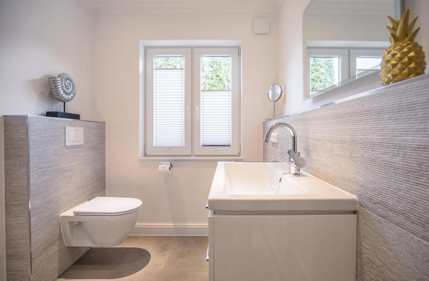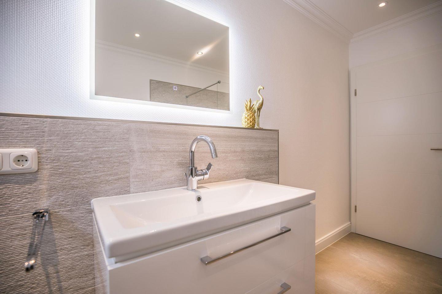 beleuchteter Spiegel, WC, Waschbecken mit Unterschrank, bodentiefe Dusche, Kosmetikspiegel, Fenster mit Plissee und Fliegengitter