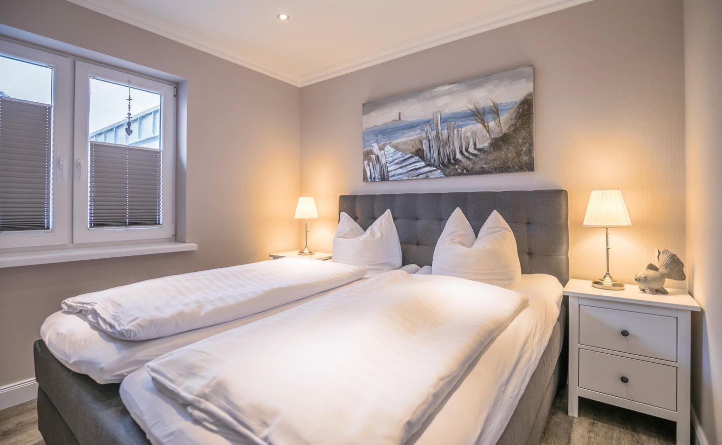 Einen erholsamen Schlaf finden Sie in dem gemütlichen Boxspringbett - auch ein großer Flachbild-TV hängt im Schlafzimmer.