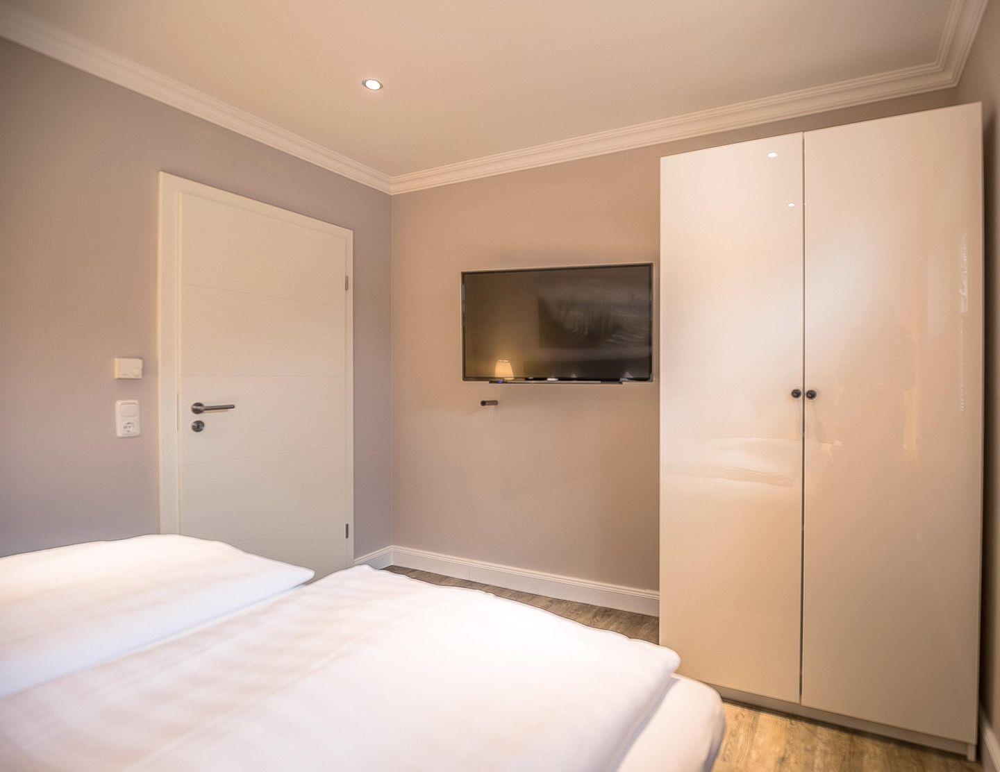 Boxspringdoppelbett (einzelne Topper 0,90m breit), Nachttische + Lampen, Kleiderschrank 2-türig, Flachbild-TV, Verdunkelungsplissees- und Jalousie, Fliegengitter