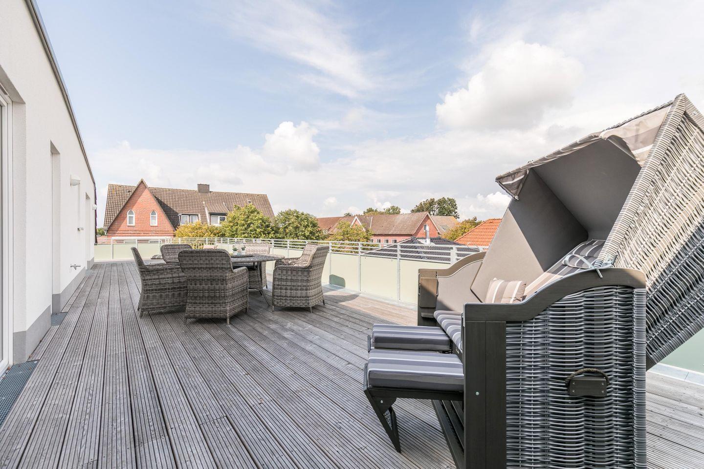 Die exklusive Penthouse Wohnung MeerGenuss - belegbar mit 5 Personen - befindet sich in einem behindertengerechten Mehrfamilienhaus in zentraler Lage von Büsum. Eine riesige Dachterrasse (83m²) ist das Highlight dieser hochwertig und modern eingerichteten Ferienwohnung! Eine weitere südlich ausgerichtete Dachterrasse (20m²) macht den Rundum-Blick über Büsum perfekt.
