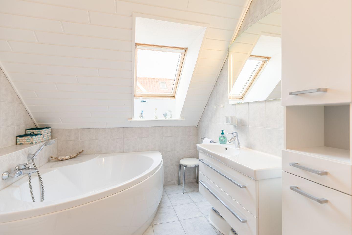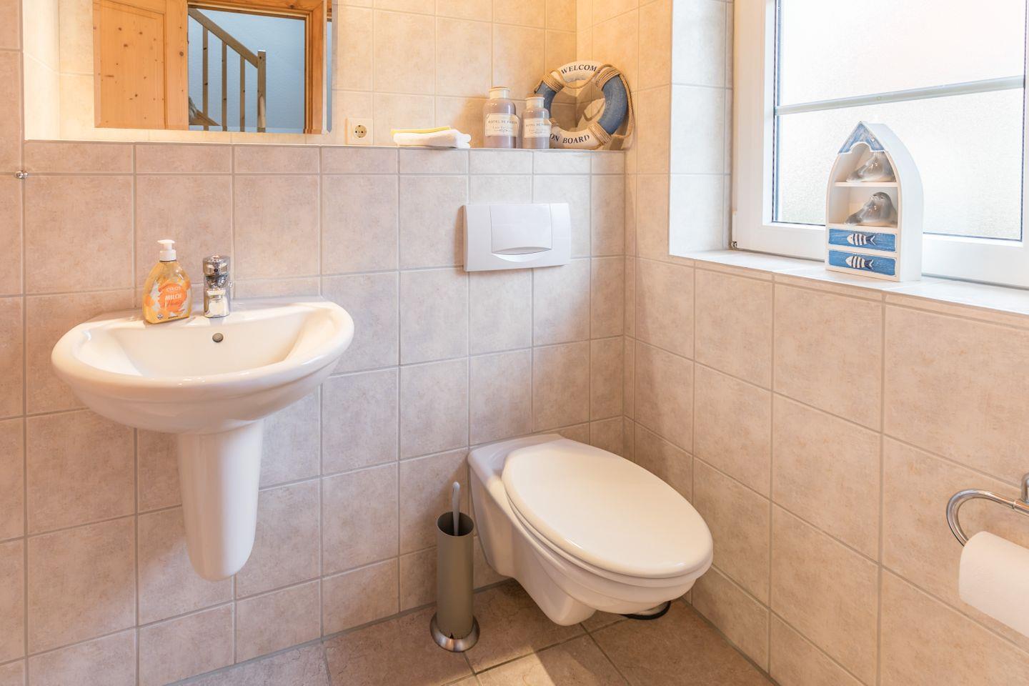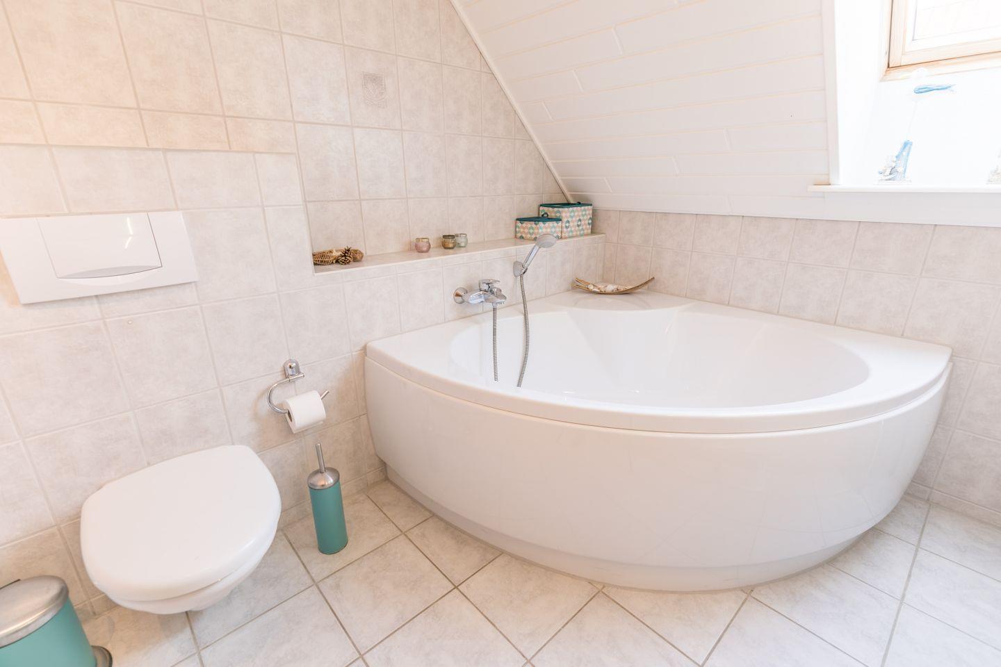Im Obergeschoss befinden sich drei Schlafzimmer (zwei mit Doppelbetten, eines mit zwei Einzelbetten) sowie ein zweites Badezimmer mit Dusche und Eckbadewanne.