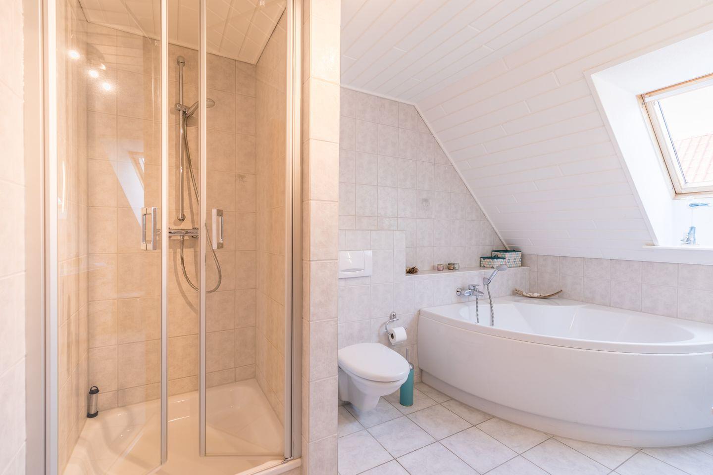Dusche, WC, Eck-Badewanne, Spiegelschrank