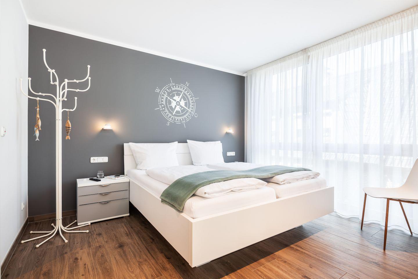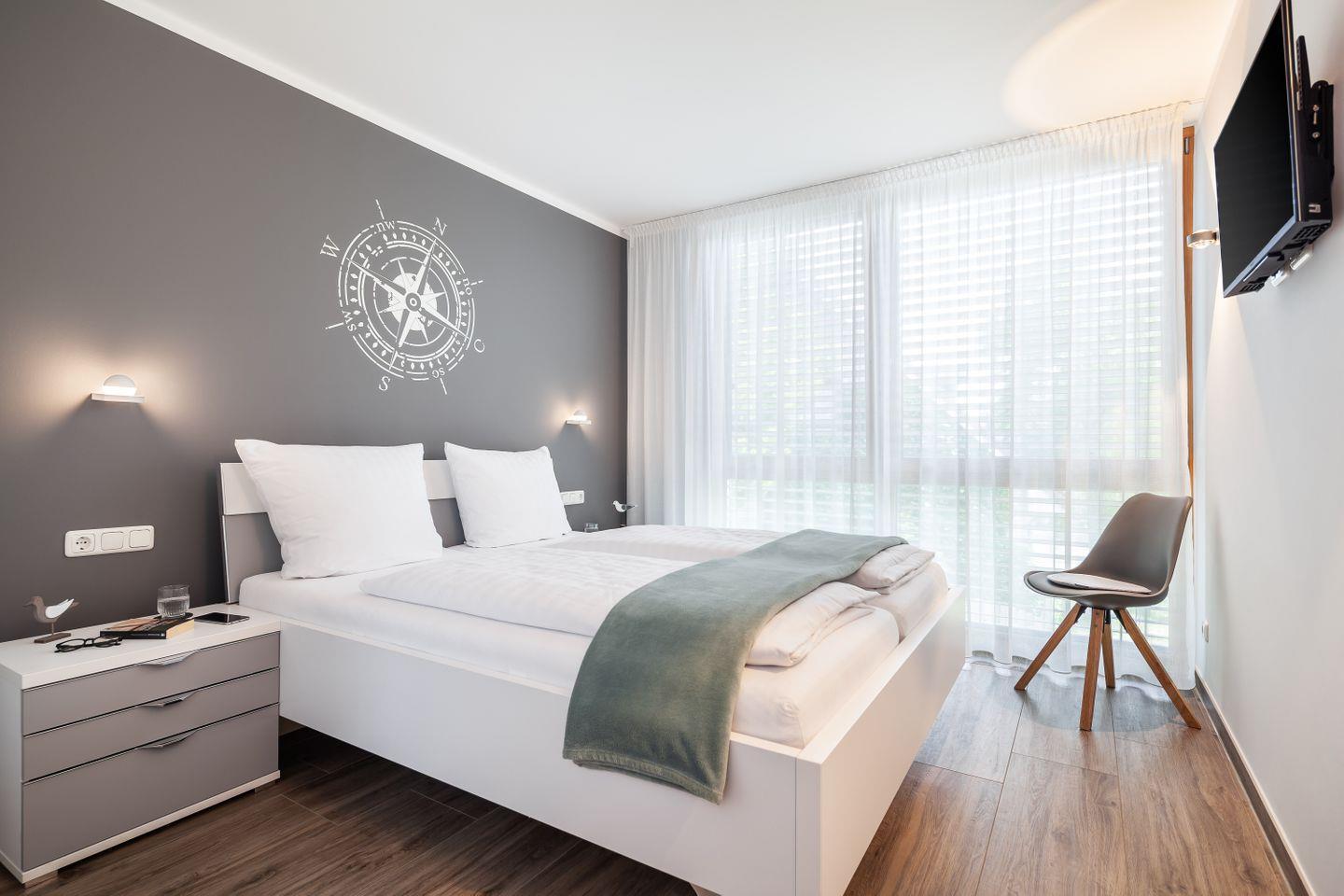 Doppelbett (1,60x2,00m), Nachttische + Lampen, Kleiderschrank, Flachbild-Smart-TV, elektrische Verdunkelungsrollos, Insektenschutz