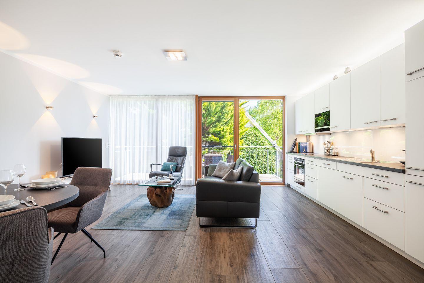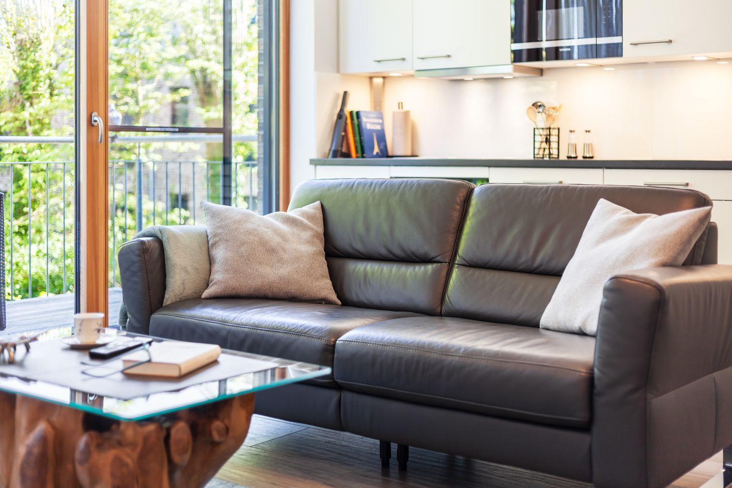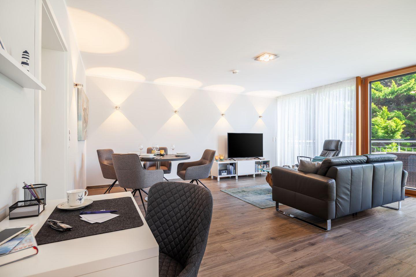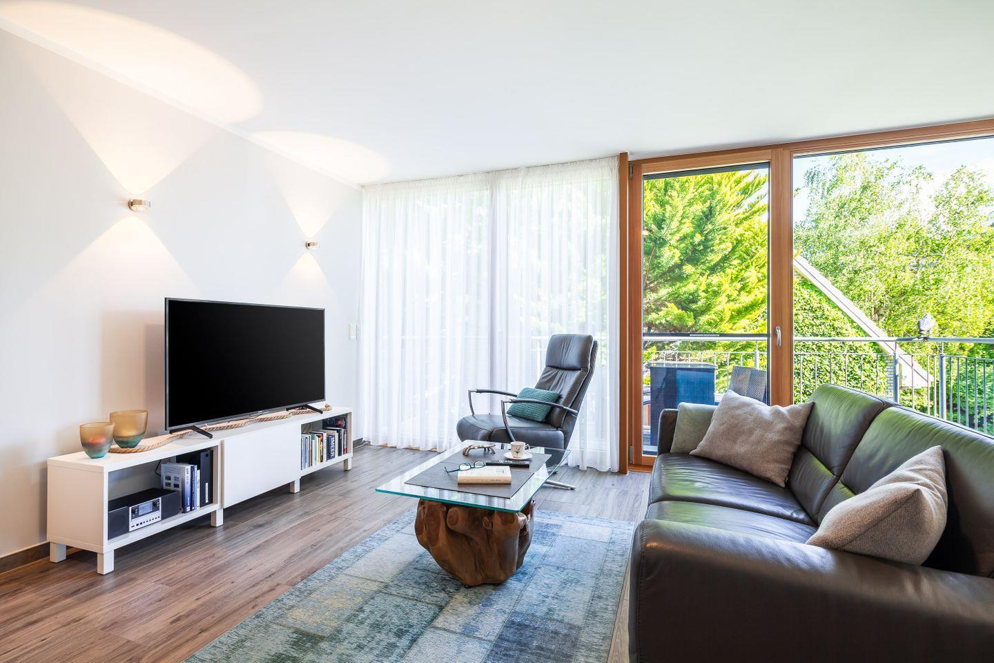 Ledercouch, Relaxsessel, Couchtisch, Flachbild-Smart-TV, DAB+Radio mit Bluetooth und CD-Spieler, Esstisch + Stühle, Zugang zum möblierten Balkon, Insektenschutz