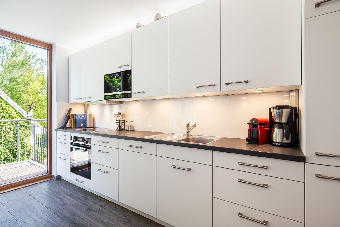 Induktionskochfeld, Backofen, Spüle, Geschirrspüler, Kühlschrank, Gefrierschrank (2 Fächer), Mikrowelle, Kaffeemaschine,