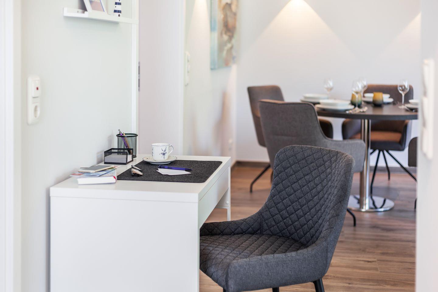 Fußbodenheizung in der kompletten Wohnung, W-LAN, Bücher, Garderobe, HomeOffice mit all-In-One-Druckgerät (Drucker, Scanner, Kopierer), Ganzkörperspiegel, Fahrstuhl, 1 kostenloser Parkplatz, möblierter Balkon, Waschmaschine im Keller, Gegensprechanlage, Einbautresor, Wäsche optional dazu buchbar, E-Ladestation für E-Autos (kostenpflichtig), kostenfreier Strandkorb am Strand (von Mai bis Ende September nutzbar), kostenfreie Schwimmbad + Sauna - Nutzung im Meerzeit Büsum https://www.buesum.de/meerzeit