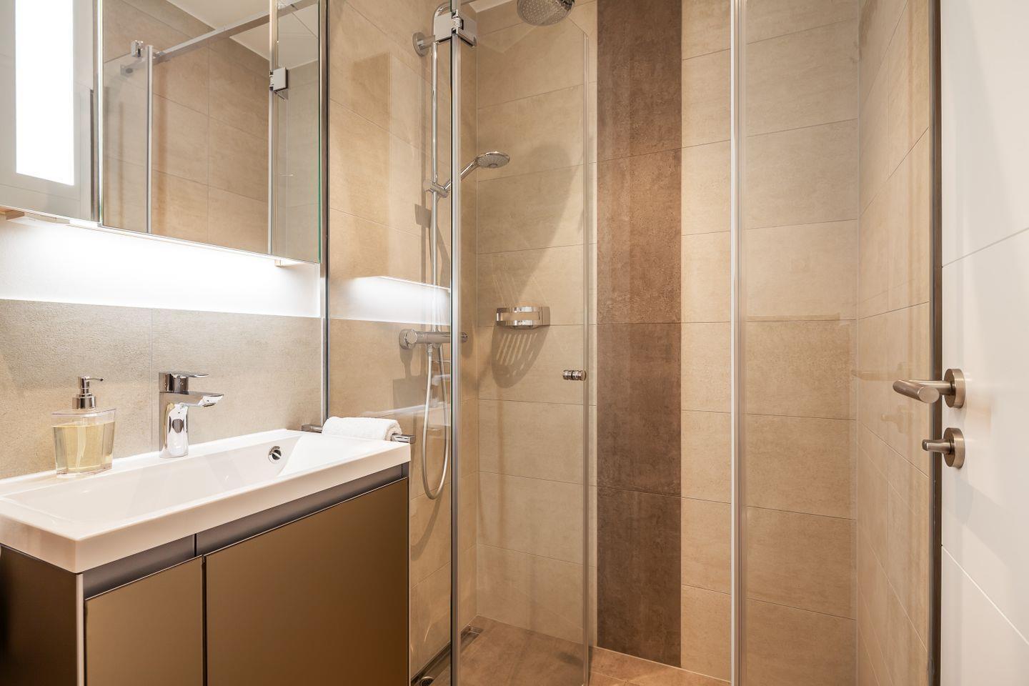 bodentiefe Dusche, WC, beleuchteter Spiegel, Waschbecken mit Unterbauschrank, Handtuchtrockner, Föhn, Abluft