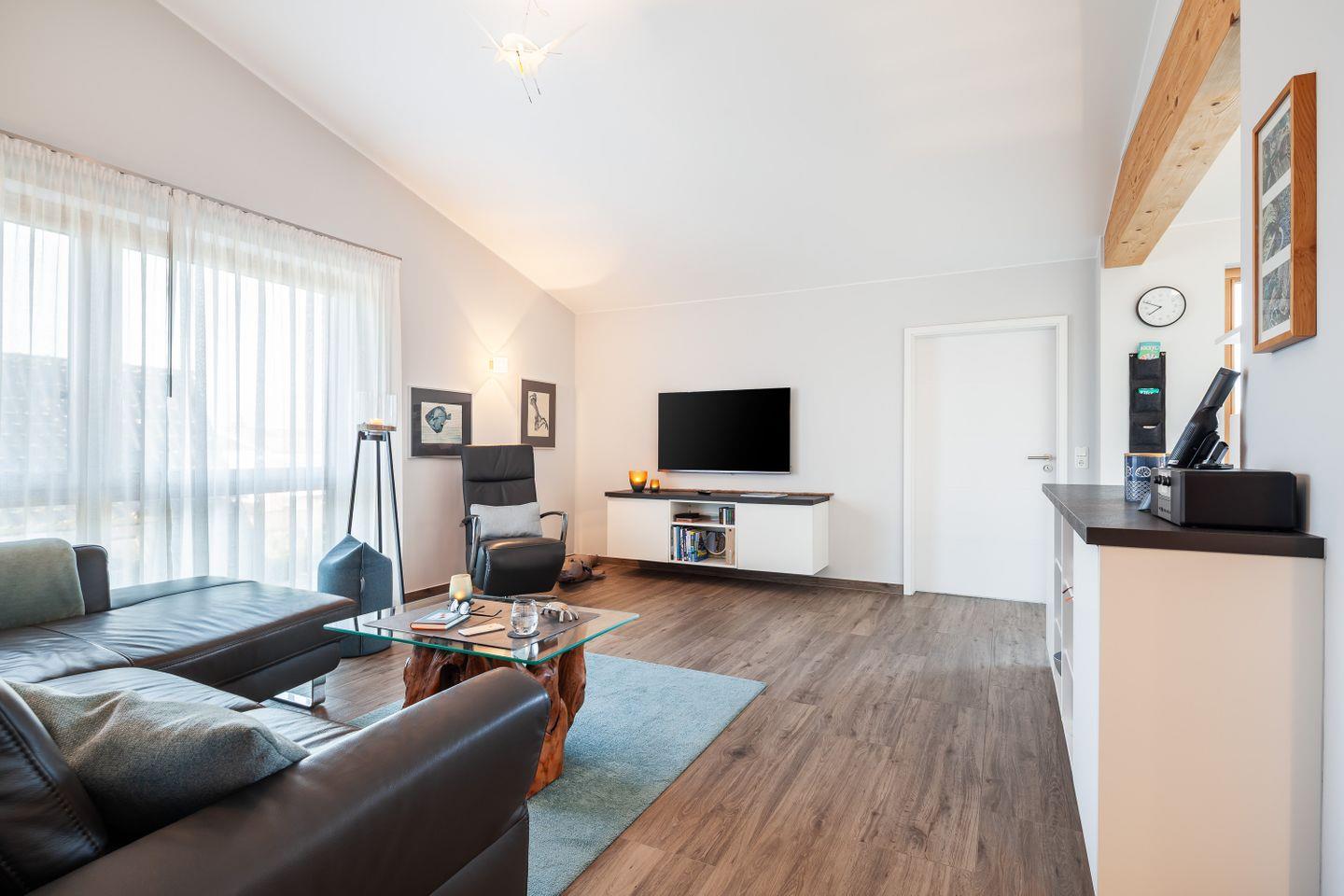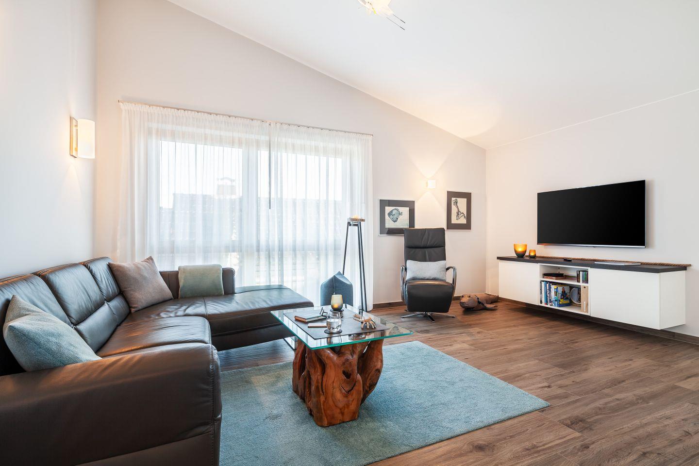 Ledercouch, Relaxsessel, Couchtisch, Flachbild-Smart-TV, DAB+Radio mit Bluetooth und CD-Spieler, Esstisch + Stühle, Zugang zum möblierten Balkon, Insektenschutz