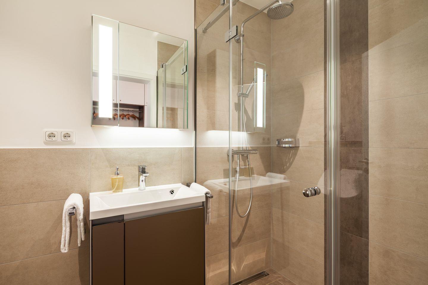 bodentiefe Dusche, WC, beleuchteter Spiegel, Waschbecken mit Unterbauschrank, Handtuchtrockner, Föhn, Abluft