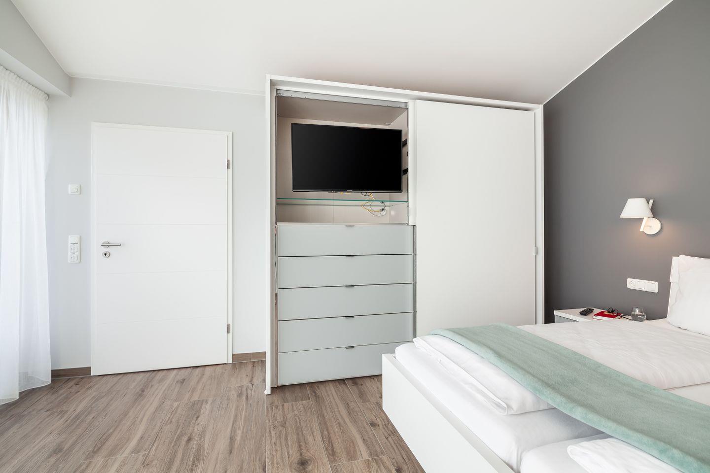 Doppelbett (2 Matratzen 0,90 x 2,00m), Nachttische + Lampen, beleuchteter großer Kleiderschrank mit eingebautem Flachbild-Smart-TV, elektrische Verdunkelungsrollos, Insektenschutz, Schreibtisch mit Home Office - Arbeitsplatz Zugang zur Dachterrasse