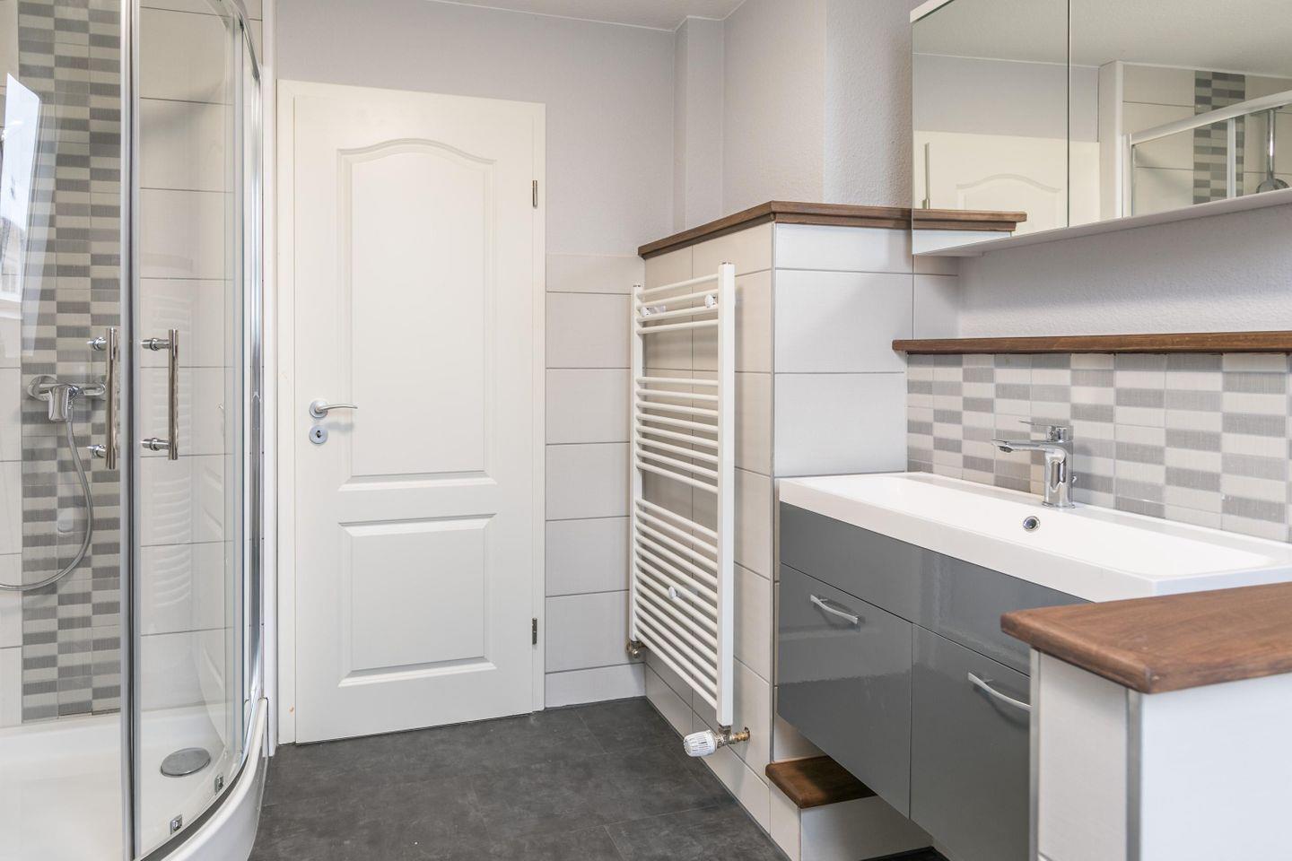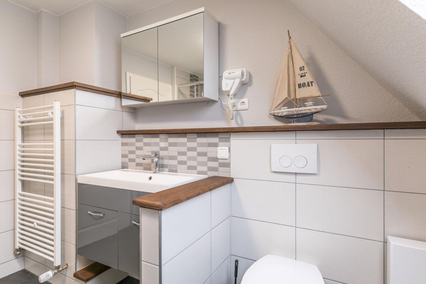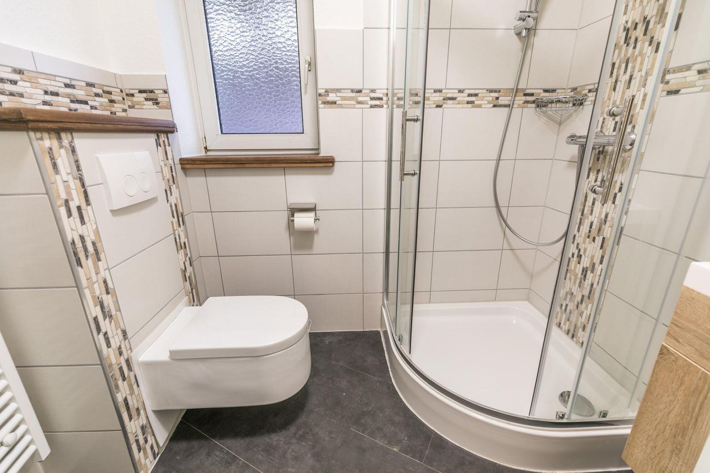 Dusche mit Duschwanne, Handtuchwärmer, Fön, Waschbecken, Spiegelschrank, WC, Fenster
