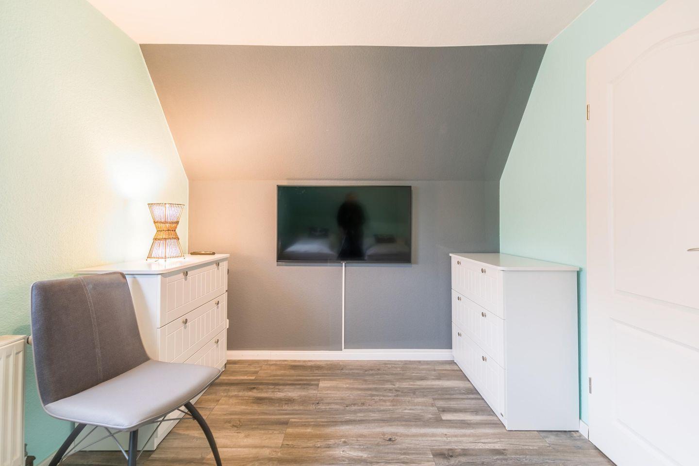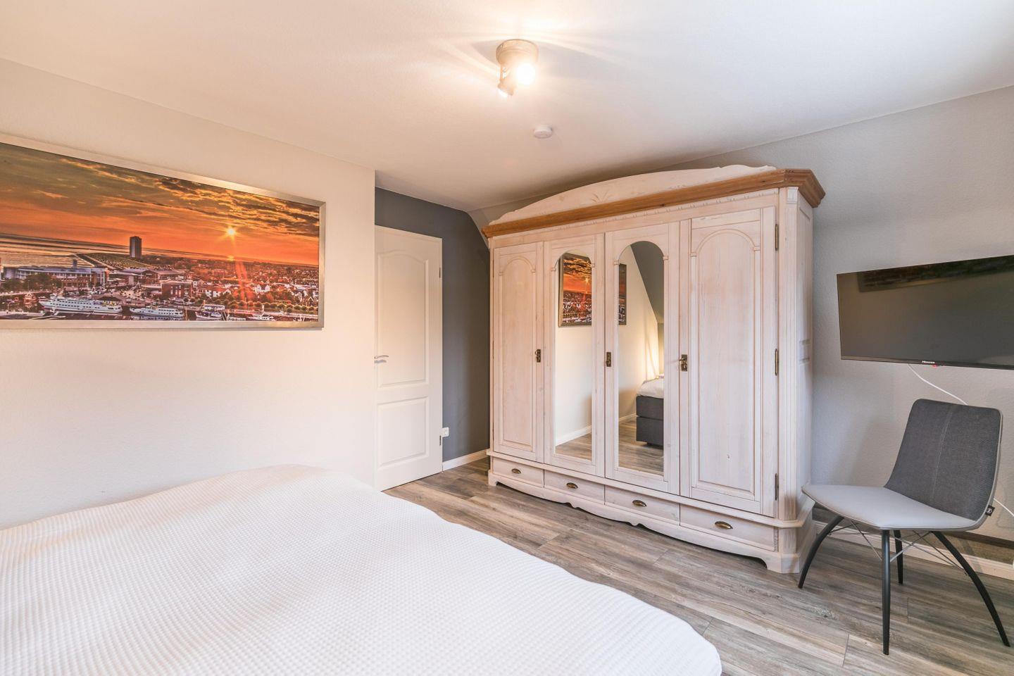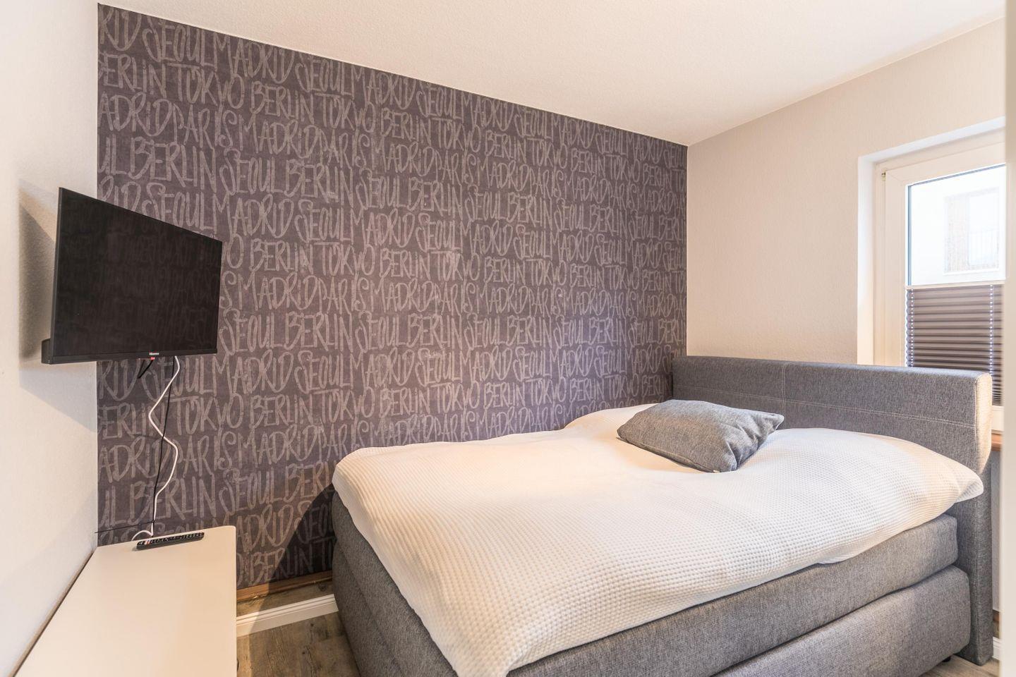 Boxspringdoppelbett mit durchgehender Topper-Matratze (1,80m x 2,00m), Nachttische + Lampen, Kleiderschrank 4 türig mit Ganzkörperspiegel, Flachbild-TV, Stuhl, Verdunkelungsplissee, Fliegengitter