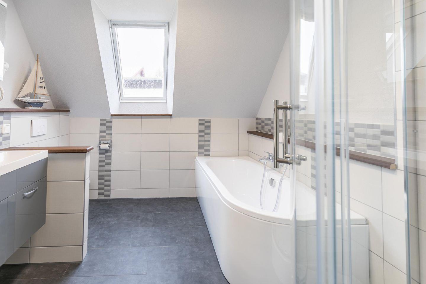 Dusch mit Duschwanne, Badewanne, Waschbecken, Spiegelschrank, WC, Fenster, Handtuchwärmer, Fön, Fenster