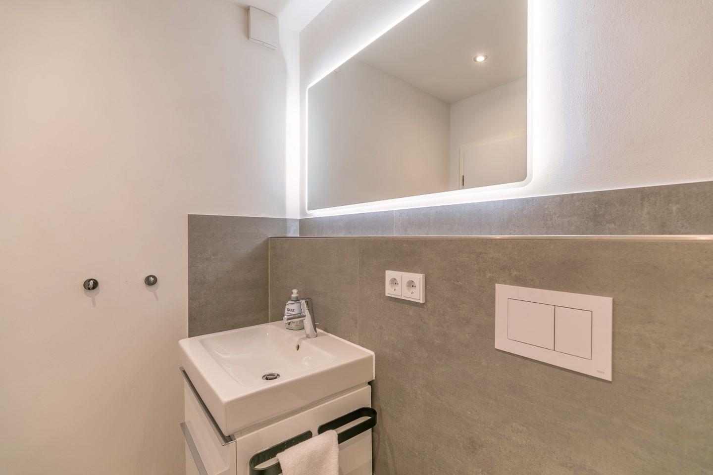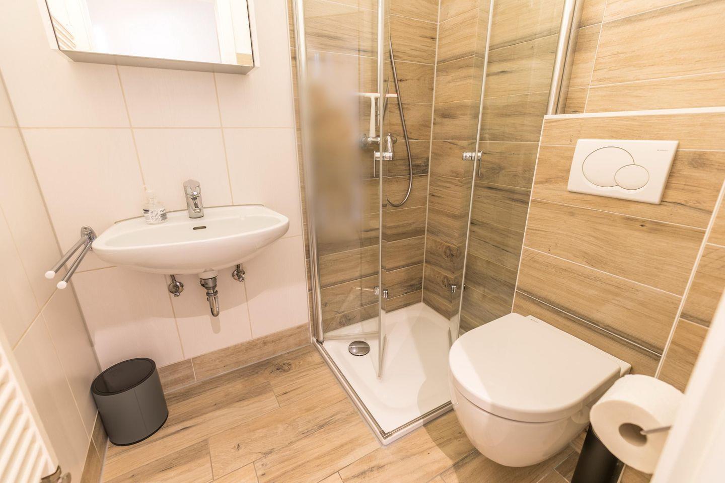 Dusche, WC, Waschbecken, Spiegel, Ablage, Abluft, Föhn