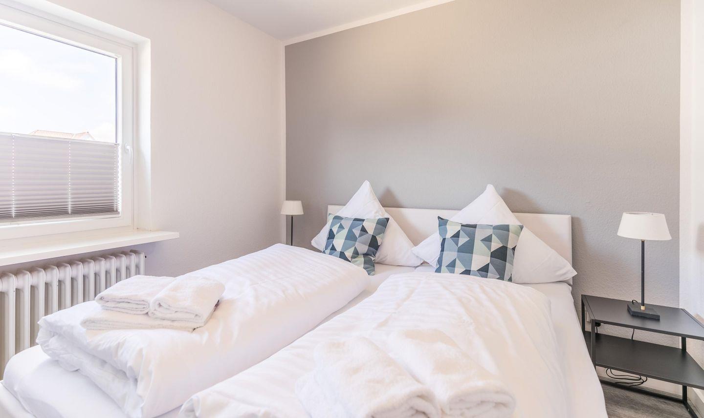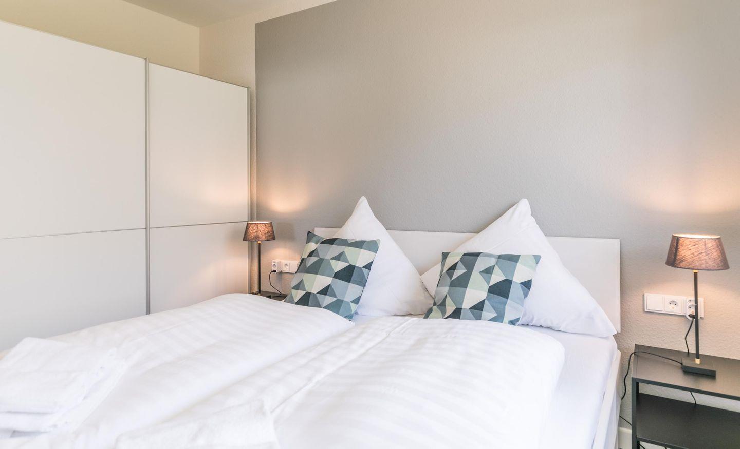 Doppelbett (1,80x2,00m) mit Nachttischen und Lampen, Lattenrost Kopf- und Fußteil höhenverstellbar, Kleiderschrank, Flachbild-TV, Verdunkelungsplissee, Schranktresor