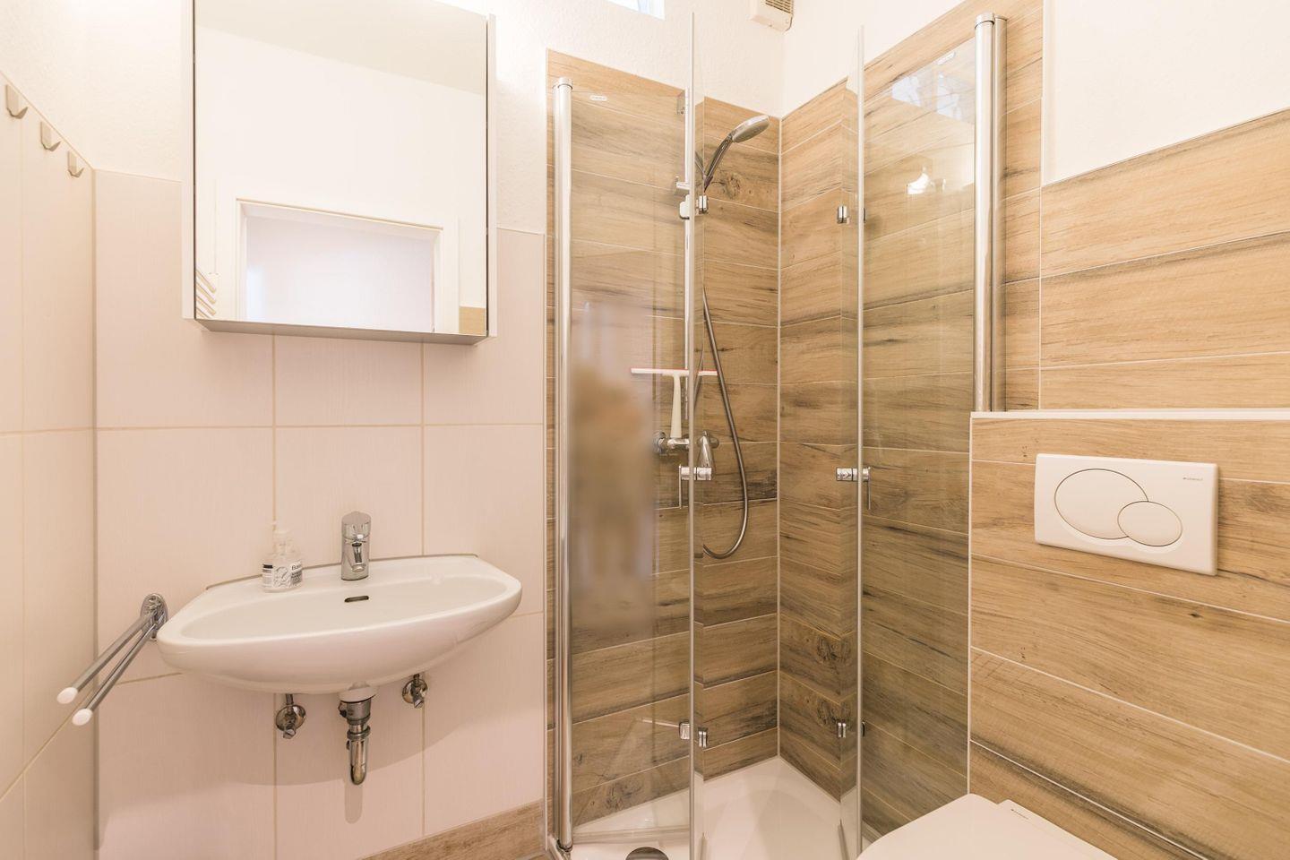 Dusche, WC, Waschbecken, Spiegel mit Ablage, Handtuchtrockner, Föhn, Fußbodenheizung, Abluft