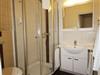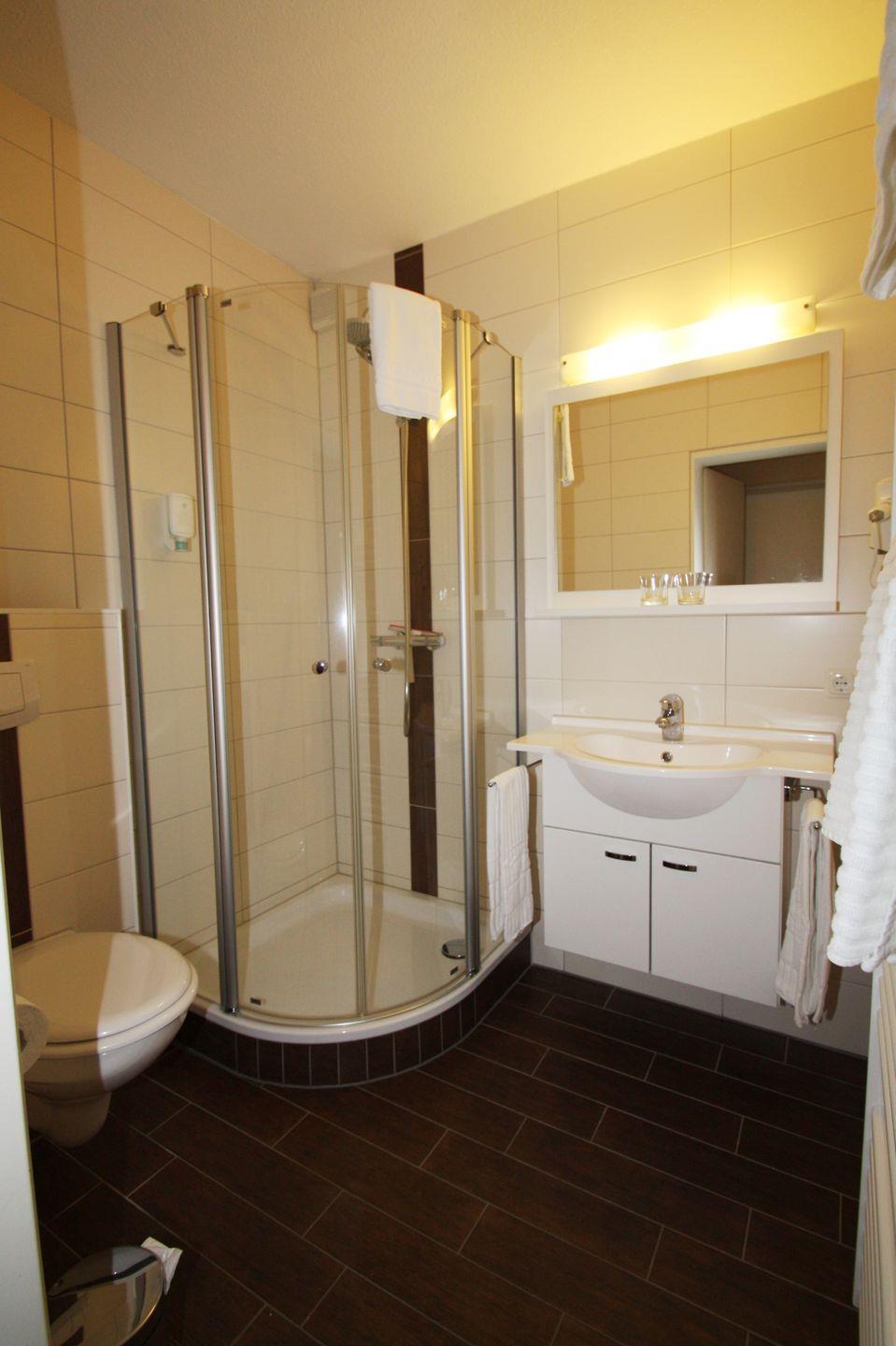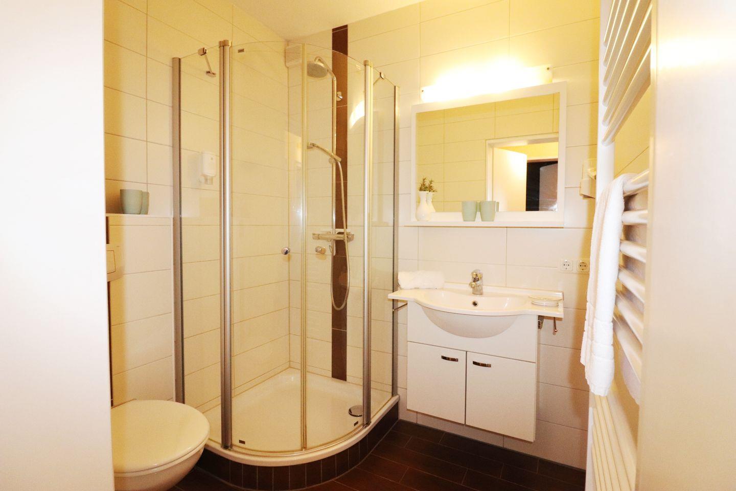 Das Bad ist modern und mit einer Dusche ausgestattet.