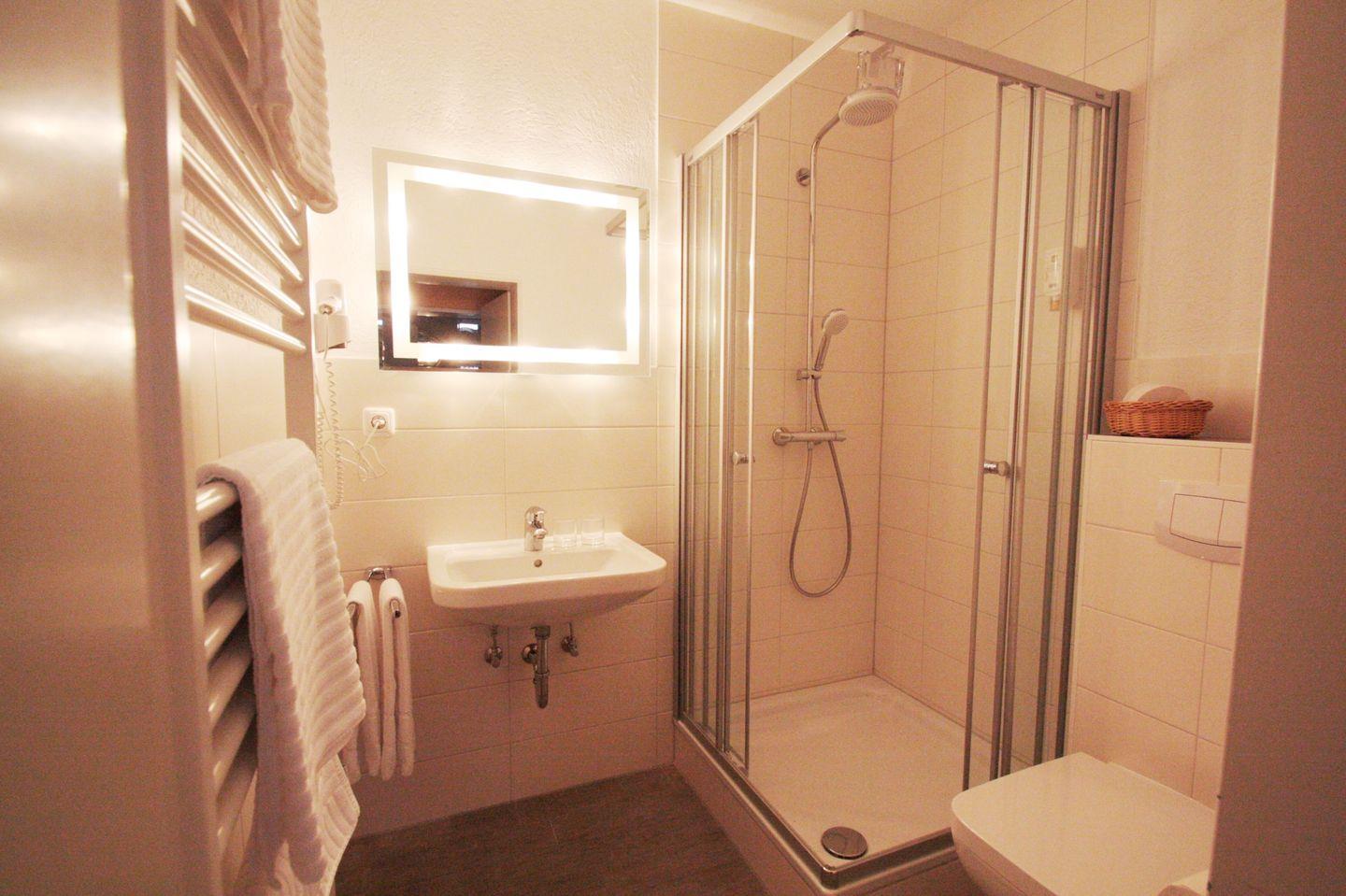 Das moderne Badezimmer mit Dusche sorgt für zusätzlichen Komfort.