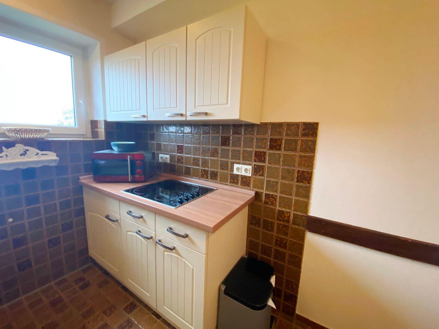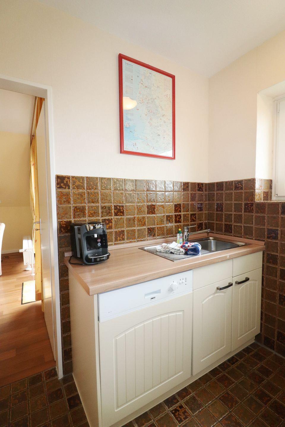 In der separaten Küche befindet sich eine gemütliche Sitzecke. Die Küche ist ausgestattet mit Herd, Spülmaschine und Mikrowelle und allen wichtigen Utensilien für die Selbstverpflegung.