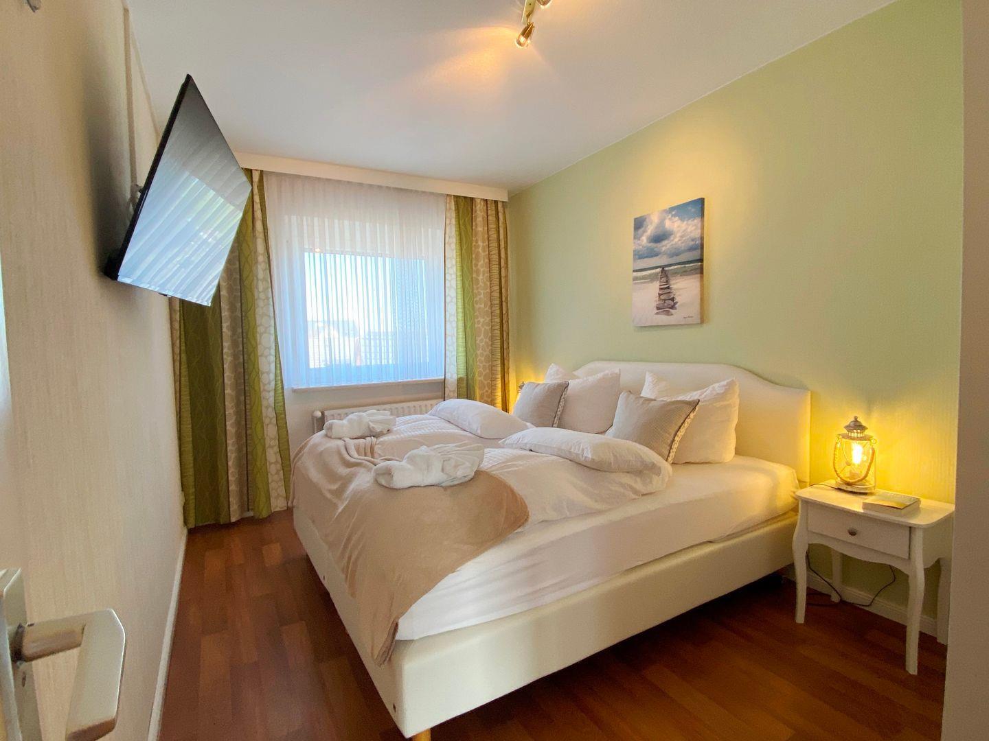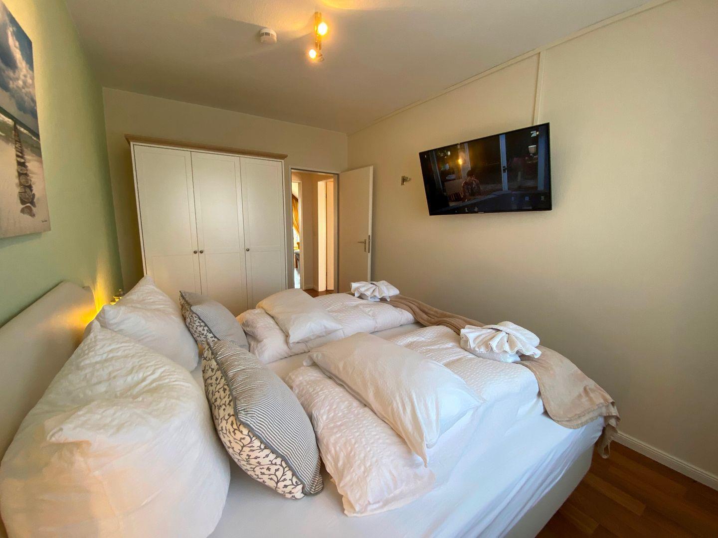 Die Wohnung ist ausgestattet mit zwei separaten Schlafzimmern. Eines mit einem komfortablen Doppelbett und das andere mit zwei Einzelbetten. In einem dieser Schlafzimmer befindet sich ein zweiter Fernseher.