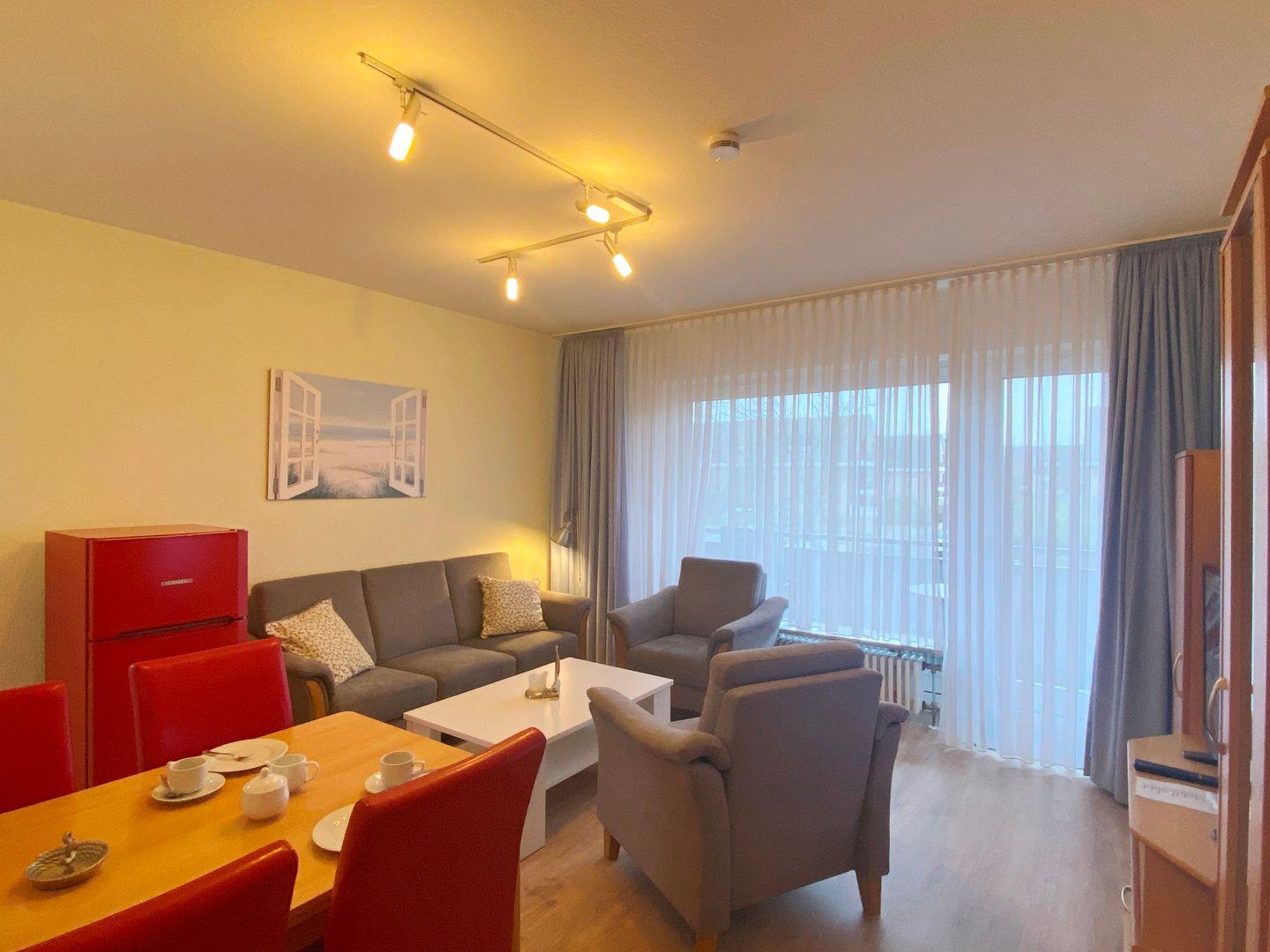 Die 3-Raum-Wohnung im 1. Stock hat ca. 65 m² und 2 Schlafzimmer (2 x Doppelbett, 2.TV im Schlafzimmer vorhanden). Auf Wunsch kann die Wohnung mit einem Kinderbett ergänzt werden. Die Wohnung hat einen Balkon, eine separate Küche und 2 Duschbäder. Die Küche hat einen Geschirrspüler, Backofen, Mikrowelle, Wasserkocher, Kaffeemaschine, Toaster, sowie Geschirr für den täglichen Bedarf sind ebenfalls vorhanden. Haustiere sind nicht erlaubt. Alle Wohnungen im Haus "Dithmarschen" verfügen über WLAN in der Wohnung.