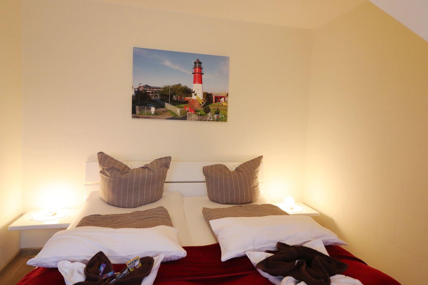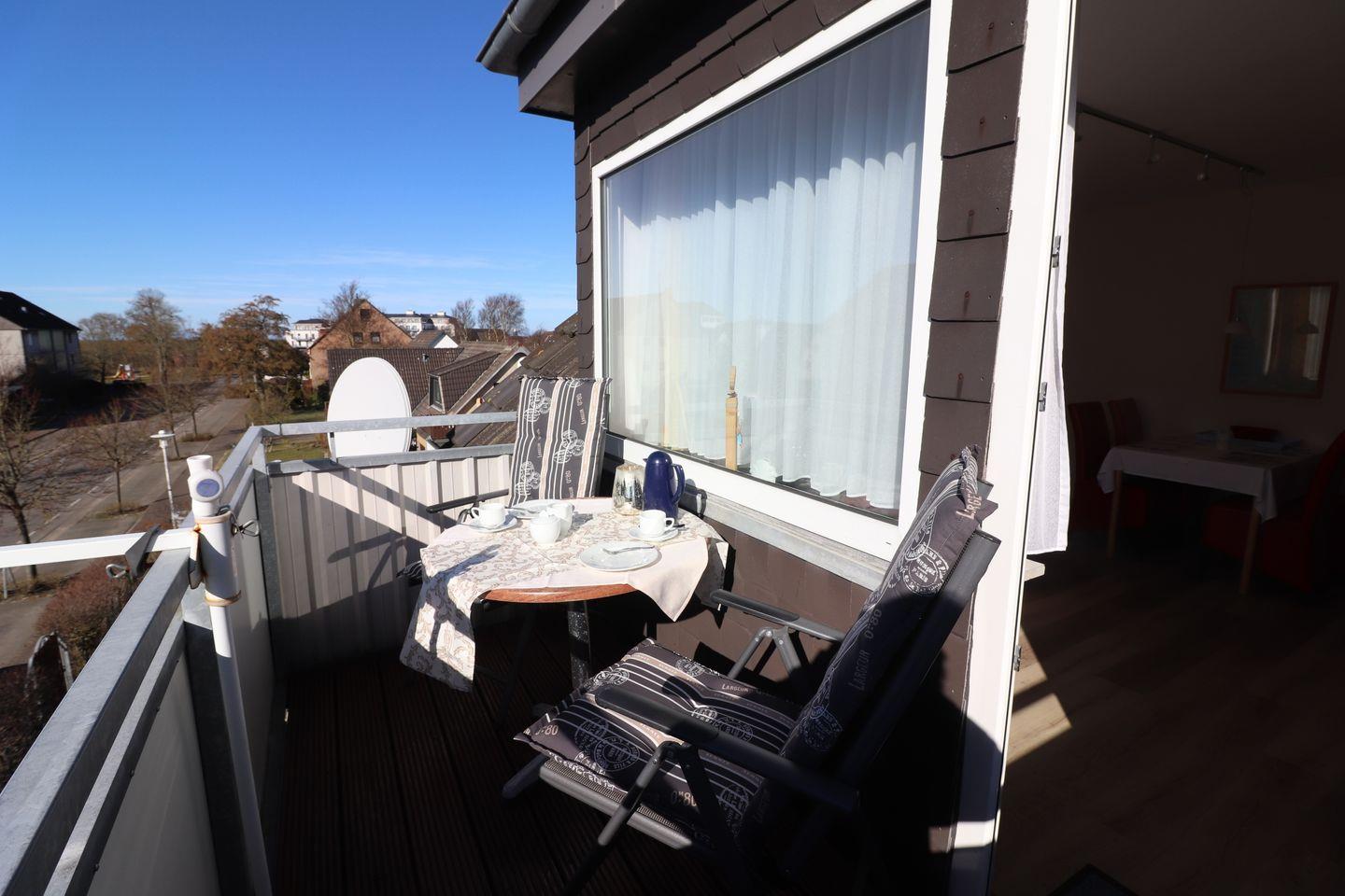 Die 3-Raum-Wohnung im 2. Stock hat ca. 55 m² und 2 Schlafzimmer (1 x Doppelbett, 2 x Einzelbett, 2. TV im Schlafzimmer vorhanden). Die Wohnung hat einen Balkon, eine separate Küche und ein Duschbad. Die Küche hat einen Geschirrspüler, Wasserkocher, Kaffeemaschine, Toaster, sowie Geschirr für den täglichen Bedarf sind ebenfalls vorhanden. Haustiere sind nicht erlaubt. Alle Wohnungen im Haus "Dithmarschen" verfügen über WLAN in der Wohnung.