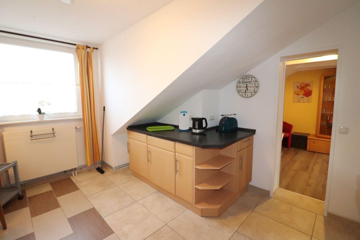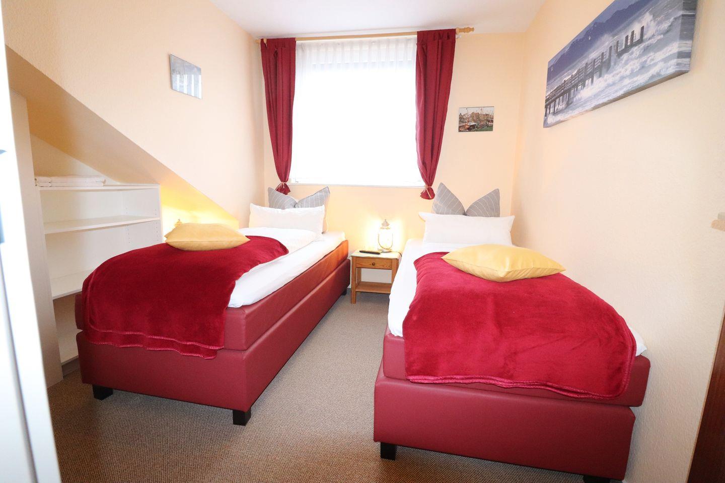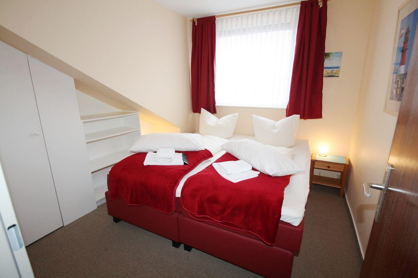 Das 2-Raum Appartement im 2. Stock auf ca. 55 m² hat 1 Schlafzimmer (1 x Doppelbett ), ein Wohnzimmer mit Balkon zur Seeseite (Süden) mit Blick auf die Nordsee, separate Küche, 2 x TV und Duschbad. Die Wohnung ist gemütlich eingerichtet. Die Einbauküche verfügt über einen Geschirrspüler, Mikrowelle, Wasserkocher, Kaffeemaschine, Toaster, sowie Geschirr für den täglichen Bedarf sind ebenfalls vorhanden. Haustiere sind nicht erlaubt.