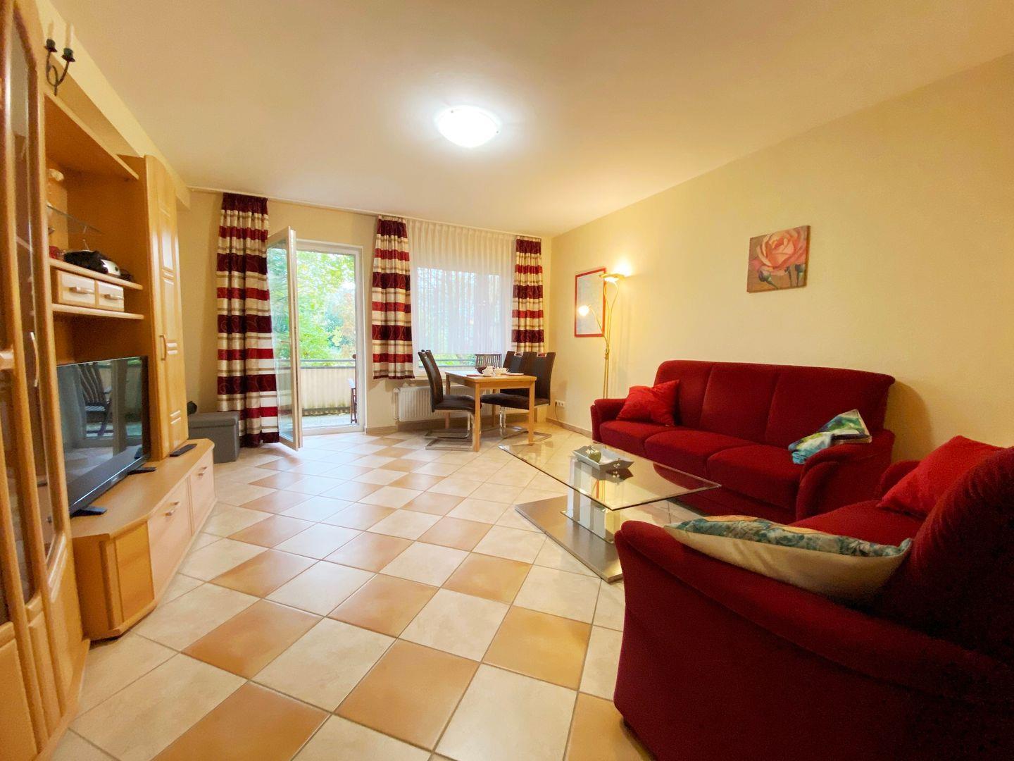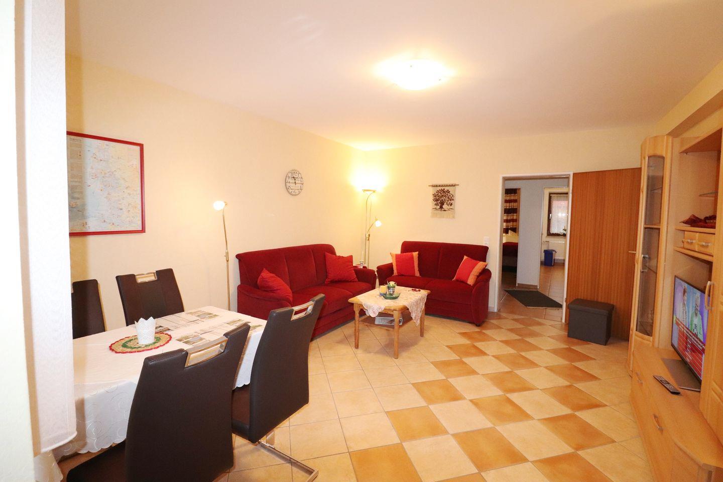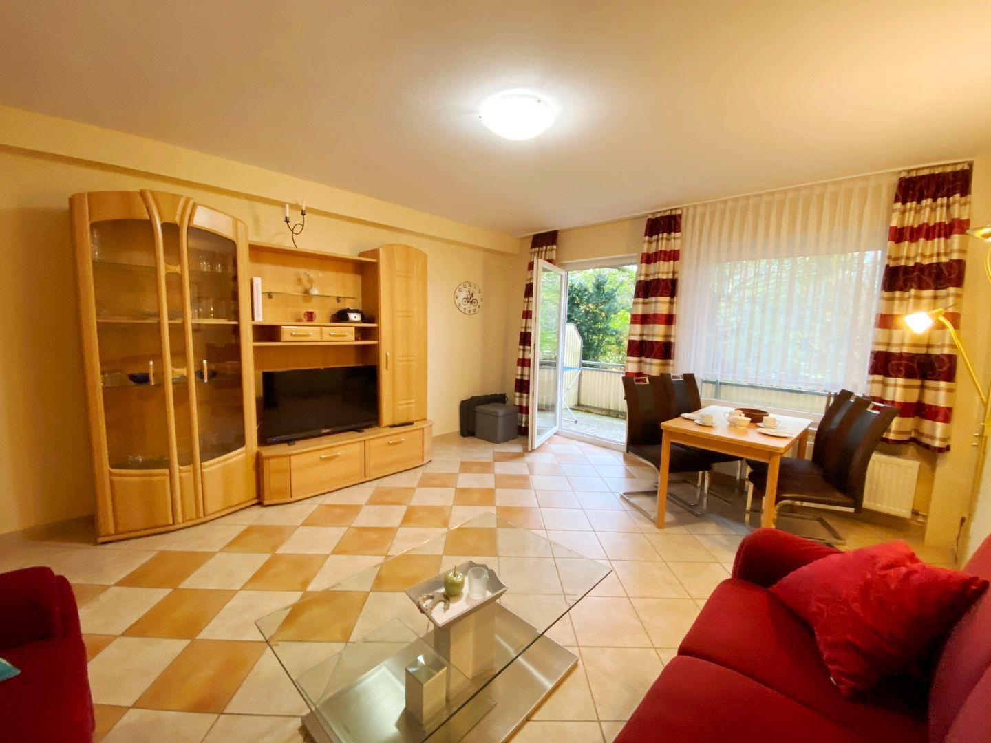 Die 2-Raum-Erdgeschosswohnung ist ca. 44m² groß, hat 1 Schlafzimmer ( 2 Einzelbetten) und ein Wohnzimmer. Die Wohnung verfügt über eine separate Küche und Duschbad. Die Küche hat einen Wasserkocher, Kaffeemaschine, Toaster, Geschirrspüler, sowie Geschirr für den täglichen Bedarf sind ebenfalls vorhanden. Die Terrasse lädt zum Entspannen ein. Haustiere nach Absprache erlaubt.