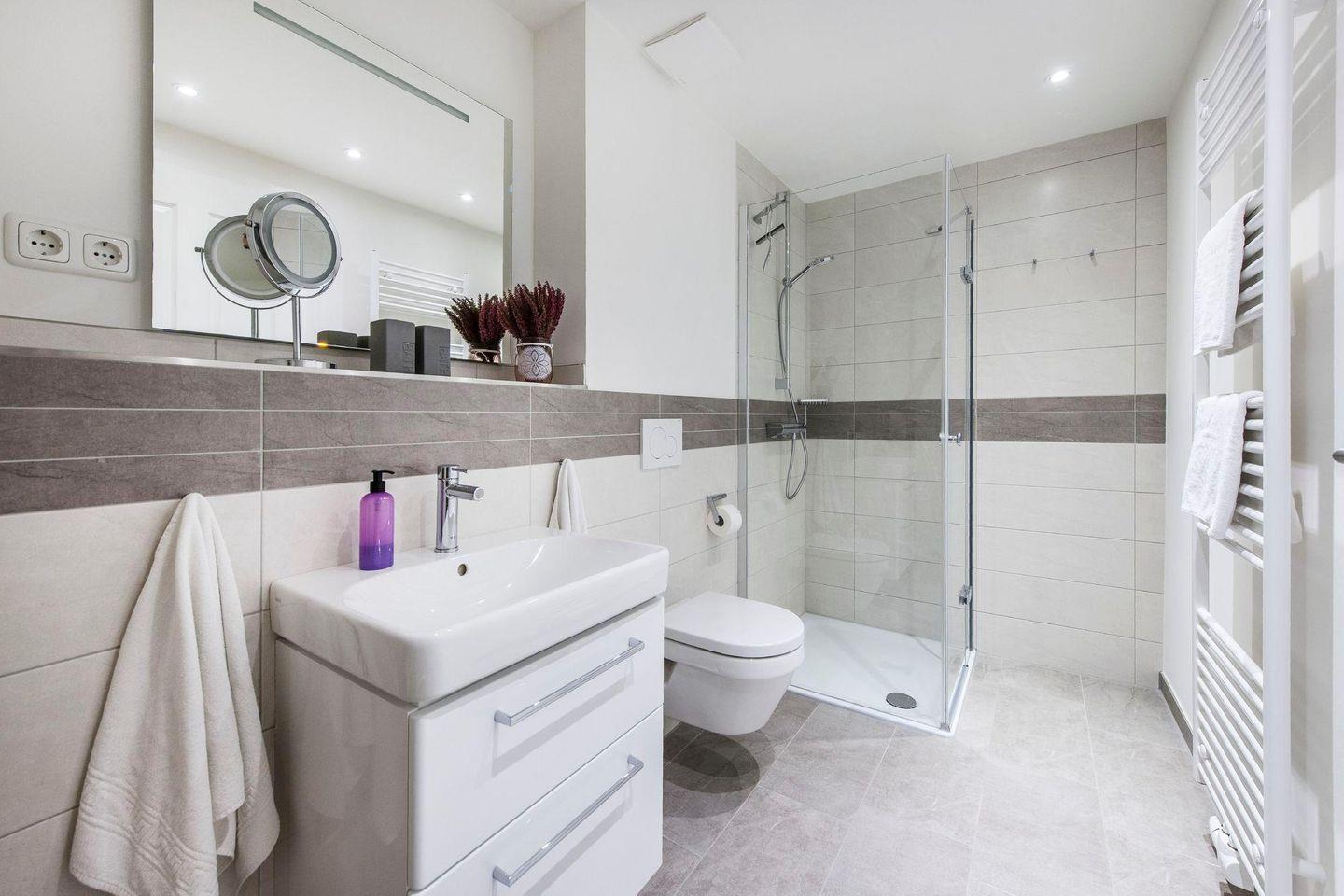 Sanitär: Duschbad mit ebenerdiger Dusche, Haar-Föhn, Kosmetikspiegel