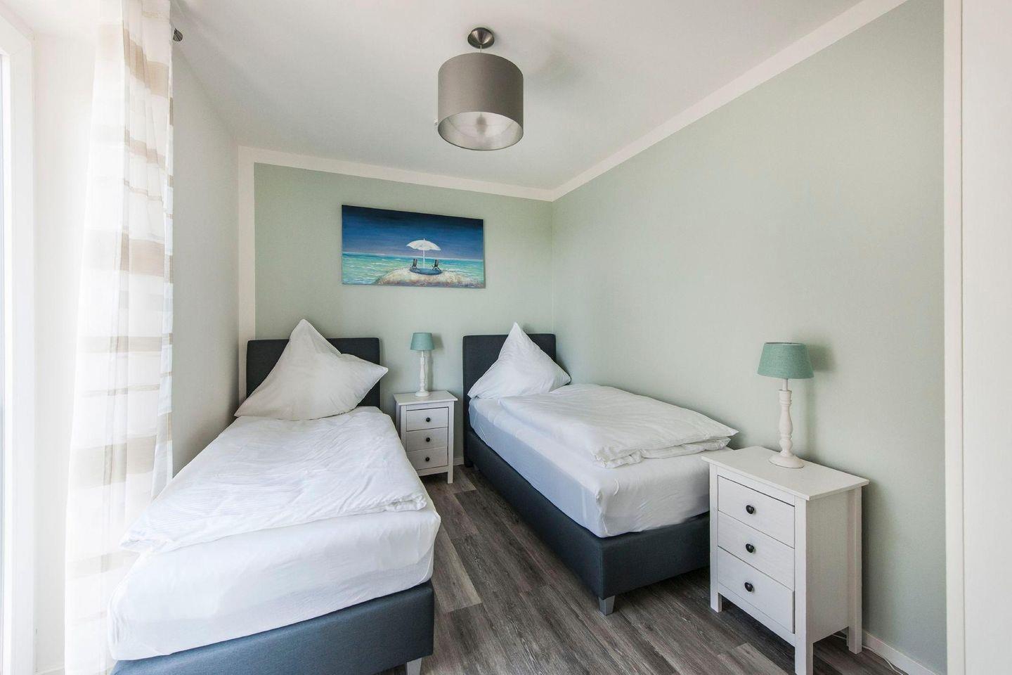 Das erste Schlafzimmer ist mit einem Doppelbett und einem Wand-Montage-Fernseher ausgestattet, das zweite Schlafzimmer mit zwei Einzelbetten.
