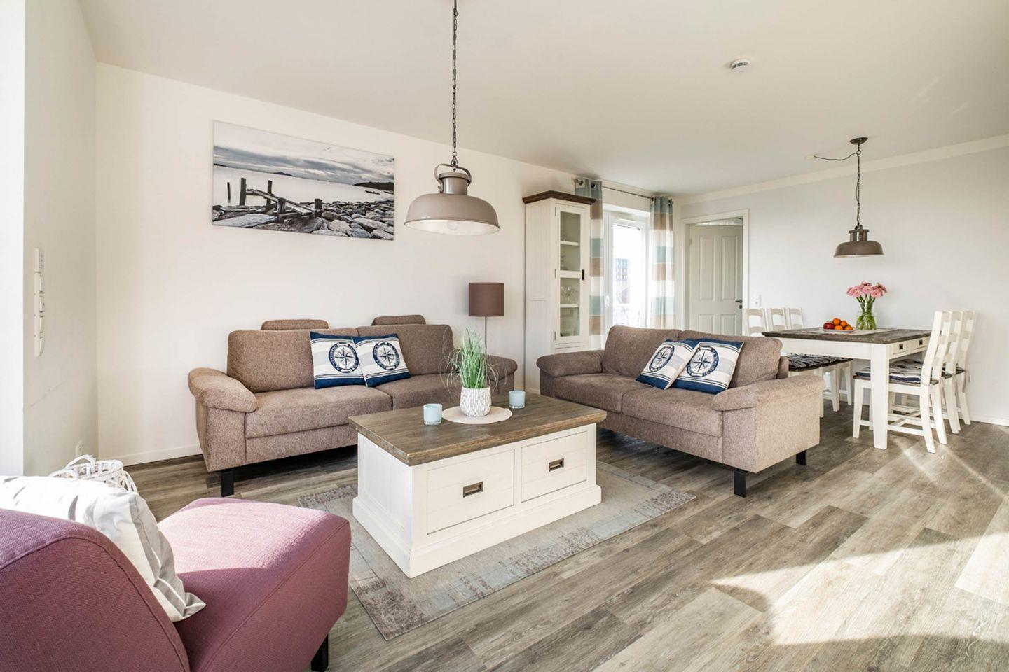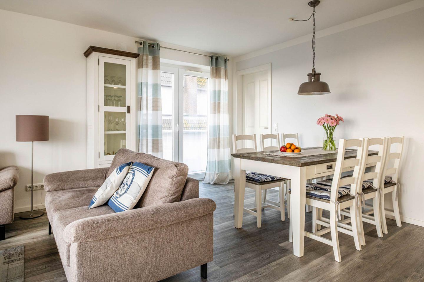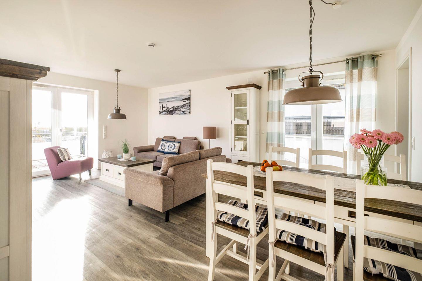 Die Ferienwohnung 2.1 ist eine wunderschöne, im Landhausstil eingerichtete 3-Raum-Wohnung mit Balkon frontal zur Nordsee. Die Küche ist separat, der Essbereich geht in den Wohnbereich über. Das Bad verfügt über eine ebenerdige Dusche, WC, Handtuchtrockner und Haar-Föhn. Vom Wohnbereich gelangen Sie direkt auf den Balkon.