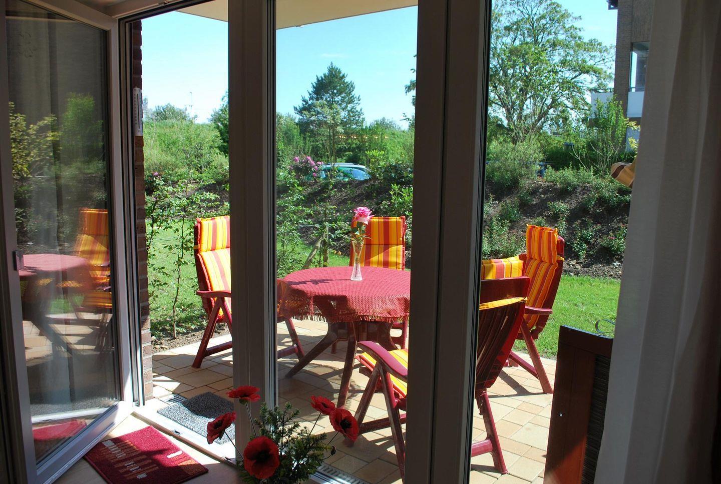 Terrasse : Südwestlage mit Terrassenmöbeln und einem Strandkorb