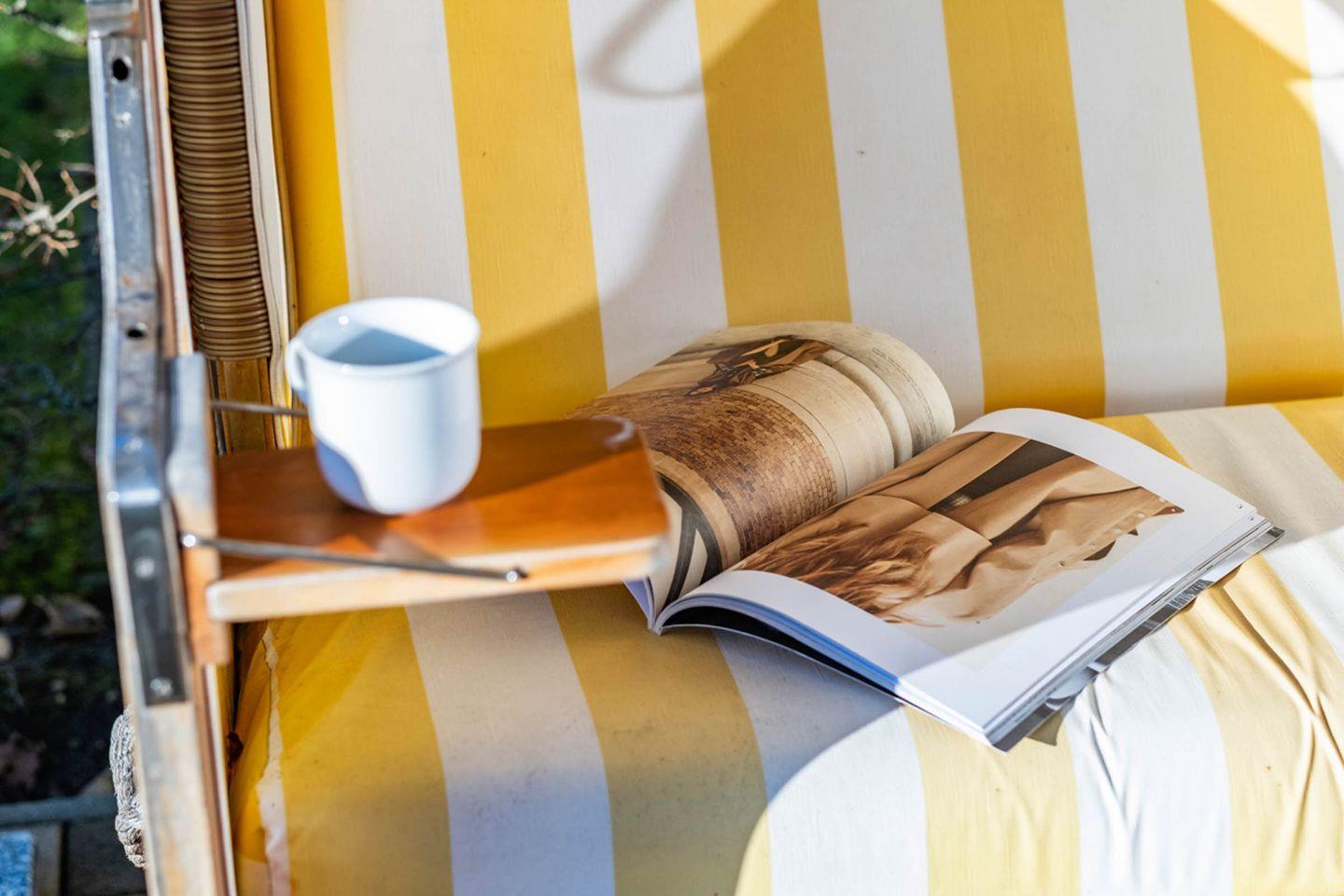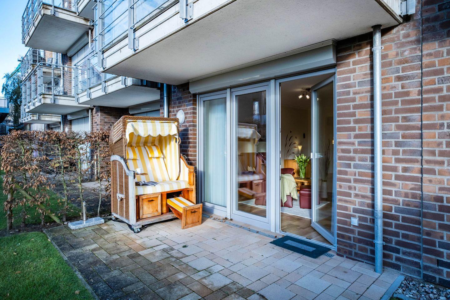 Terrasse : Südwestlage mit Terrassenmöbeln und einem Strandkorb