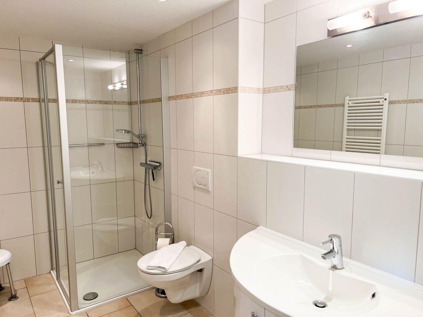 Sanitär: Duschbad mit ebenerdiger Dusche, WC, Haar-Föhn, Kosmetikspiegel, Gäste-WC