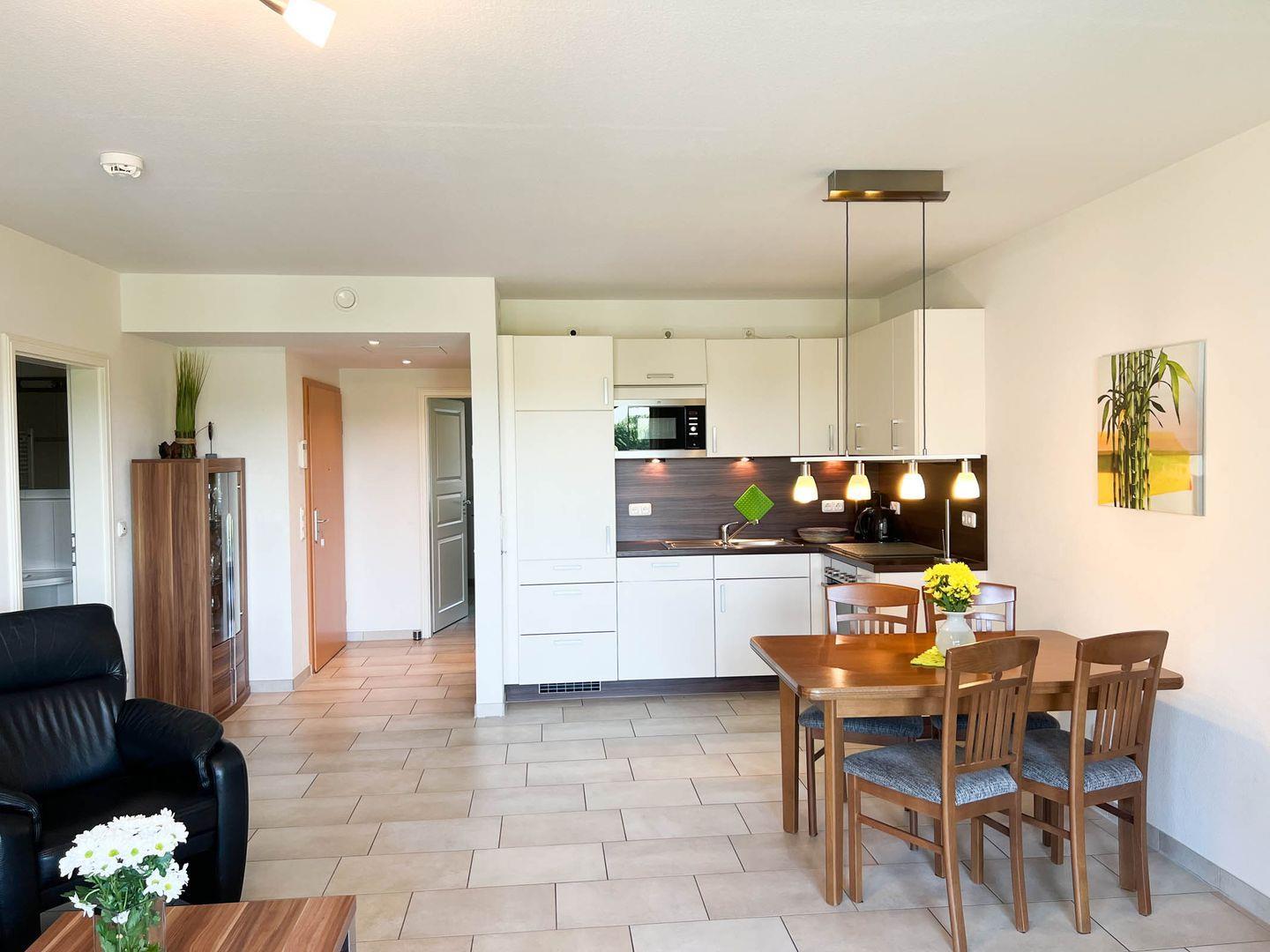 Mit einer Größe von 69 m² bietet dieses Apartment Platz für bis zu vier Personen, ideal für Familien oder Paare, die eine erholsame Zeit am Meer verbringen möchten. Das Apartment verfügt über zwei gemütliche Schlafzimmer, ein modernes Badezimmer mit einer bodengleichen Dusche sowie ein zusätzliches Gäste-WC. Der offene Wohnbereich, ausgestattet mit einer hochwertigen Küchenzeile, lädt zum gemeinsamen Kochen und Verweilen ein. Hier finden Sie alles, was Sie benötigen: einen Herd mit Cerankochfeld, einen Backofen, eine Mikrowelle sowie eine Spülmaschine. Für Ihren Kaffee am Morgen steht Ihnen eine moderne Kaffeemaschine zur Verfügung.