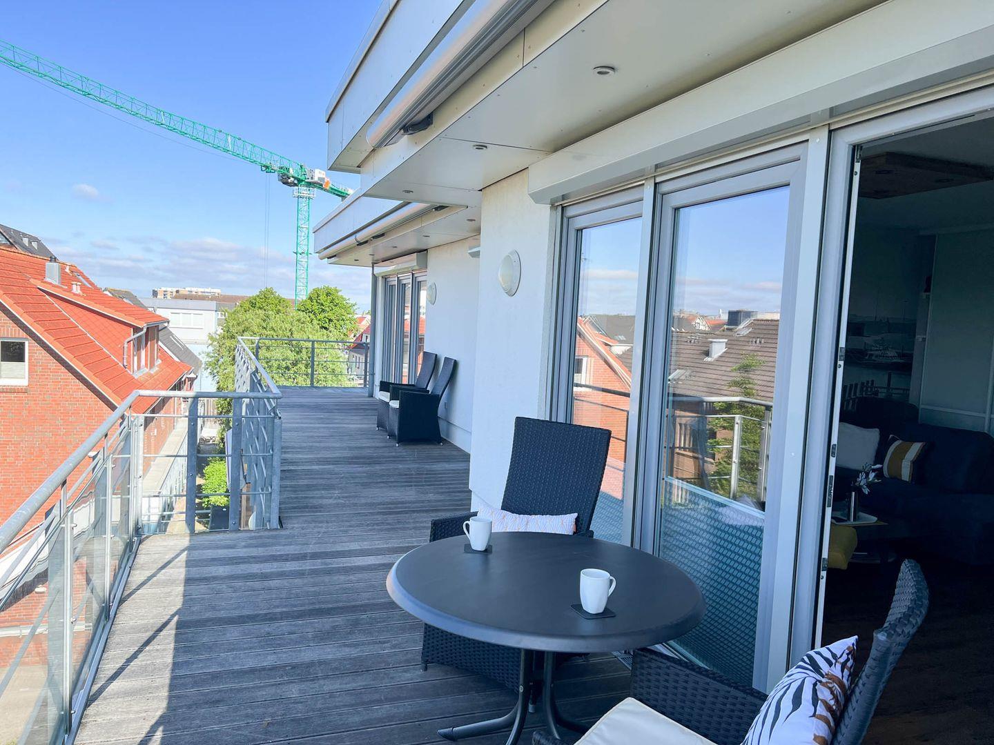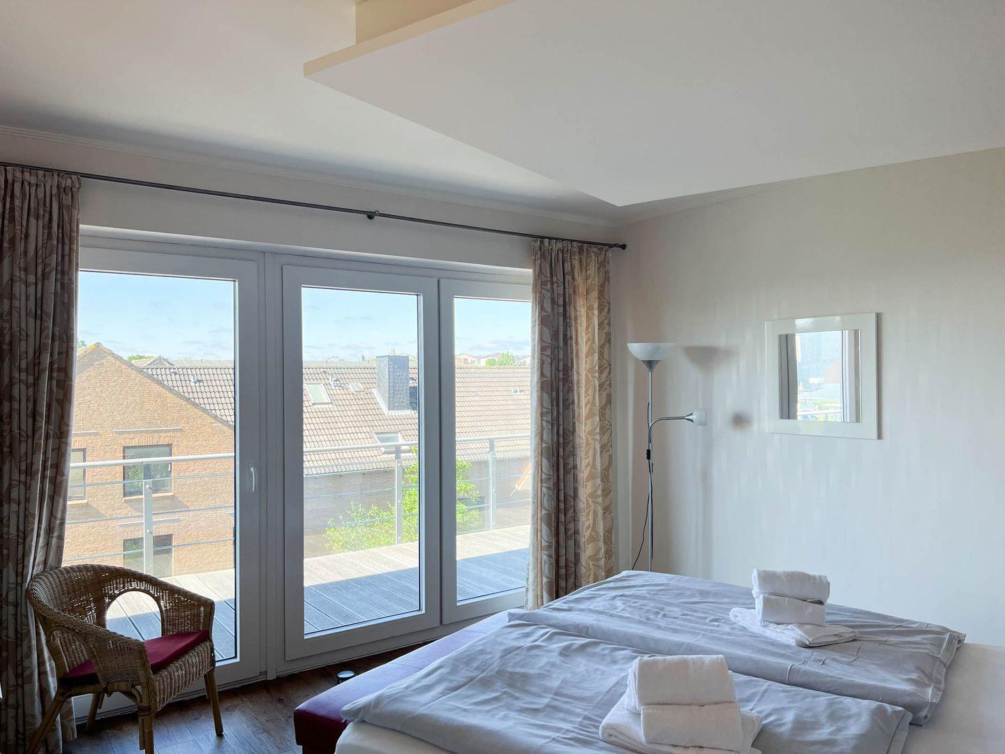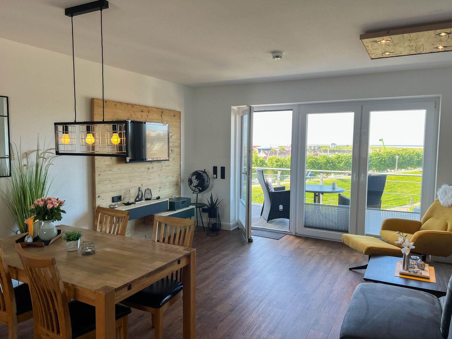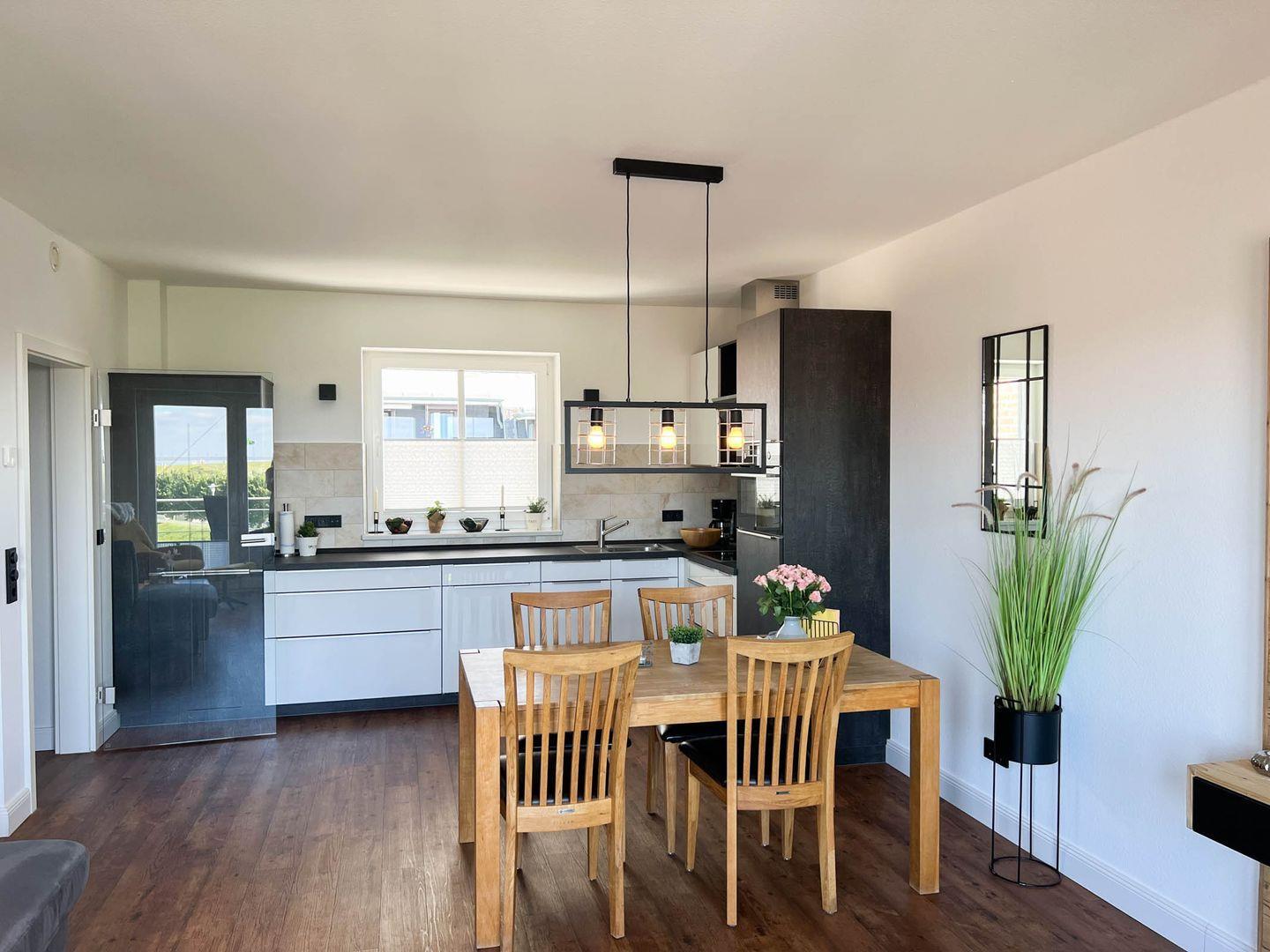 Die Ferienwohnung 3.1 (91m²) liegt im 3. Obergeschoss und ist eine helle, moderne 3-Raum-Wohnung mit Balkon in Südwest-Lage. Die Küchenzeile und der Essbereich sind direkt im Wohnbereich integriert.