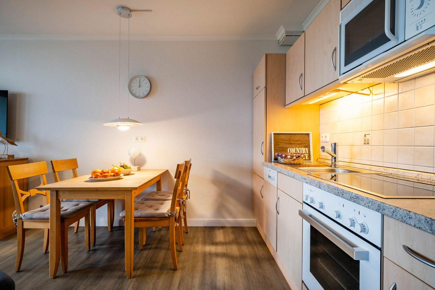 Küchenzeile: Geschirrspüler, Backofen, Kochfeld, Mikrowelle, Kühlschrank mit Gefrierfunktion, Heißwasserkocher, Kaffeemaschine, Toaster.