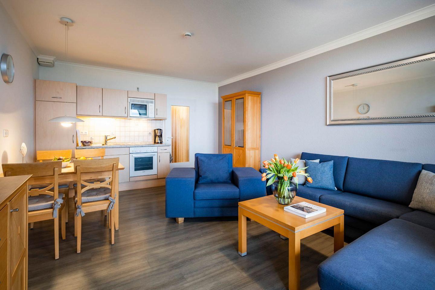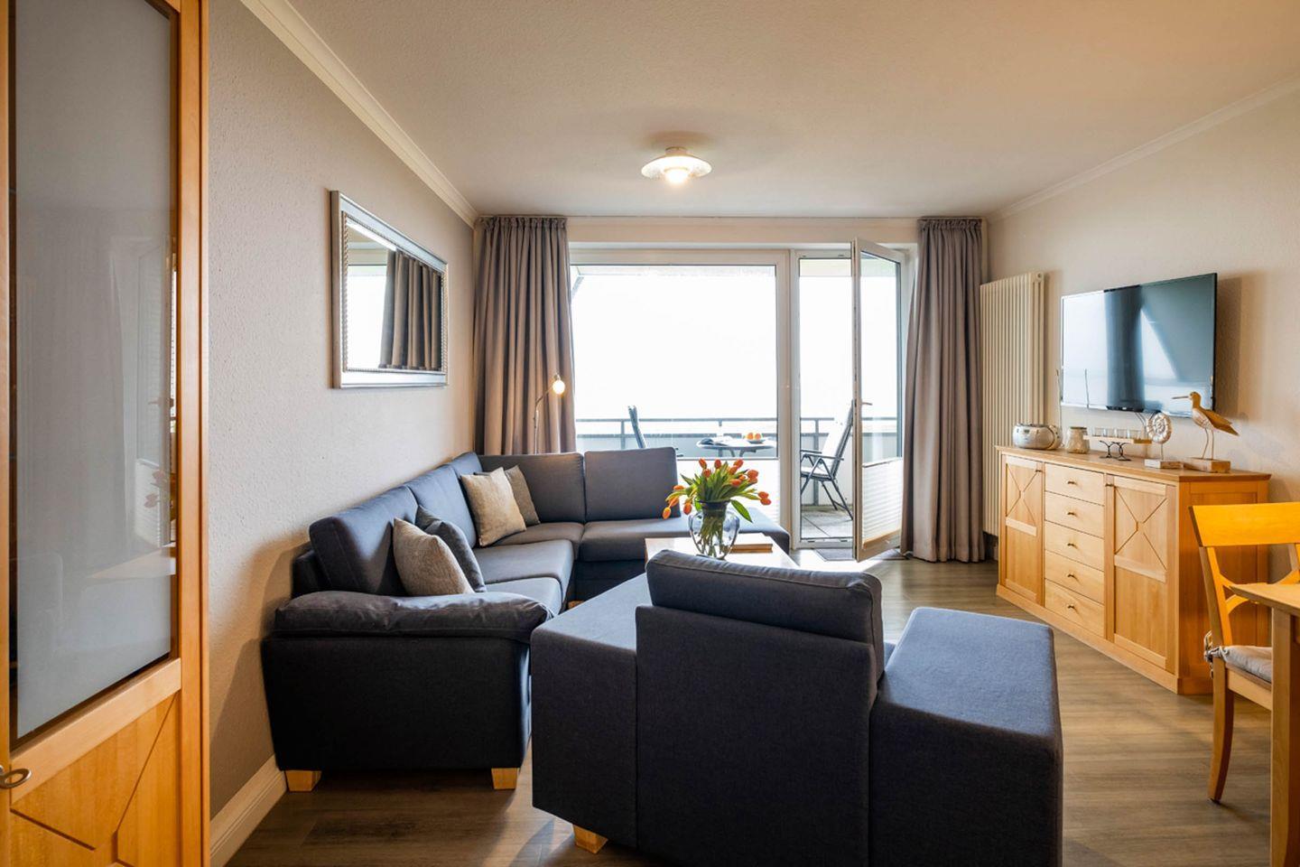 1 Wohnzimmer mit Essbereich, eine Küchenzeile, 1 Schlafzimmer mit TV und 1 Duschbad. Das Bad verfügt über eine Dusche/WC. Vom Wohnbereich gelangen Sie auf den Balkon. Das Schlafzimmer verfügt über ein Doppelbett mit elektrisch verstellbarem Lattenrost. Der Wohnung ist ein PKW-Stellplatz direkt am Haus zugehörig.