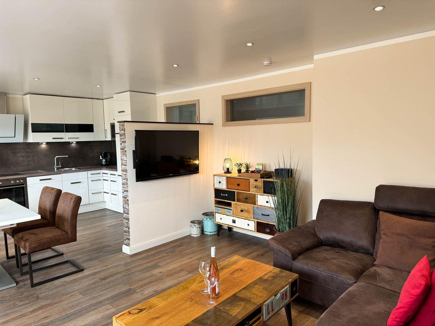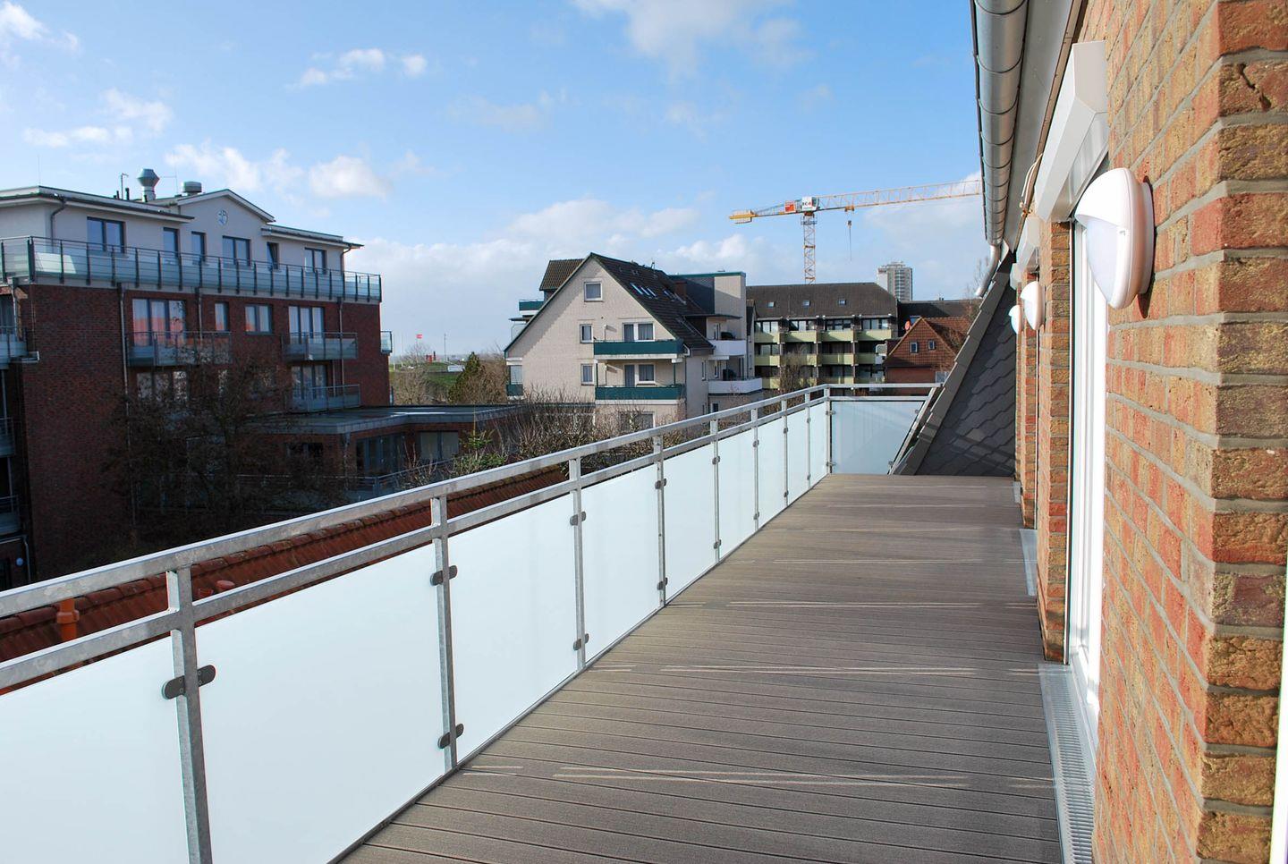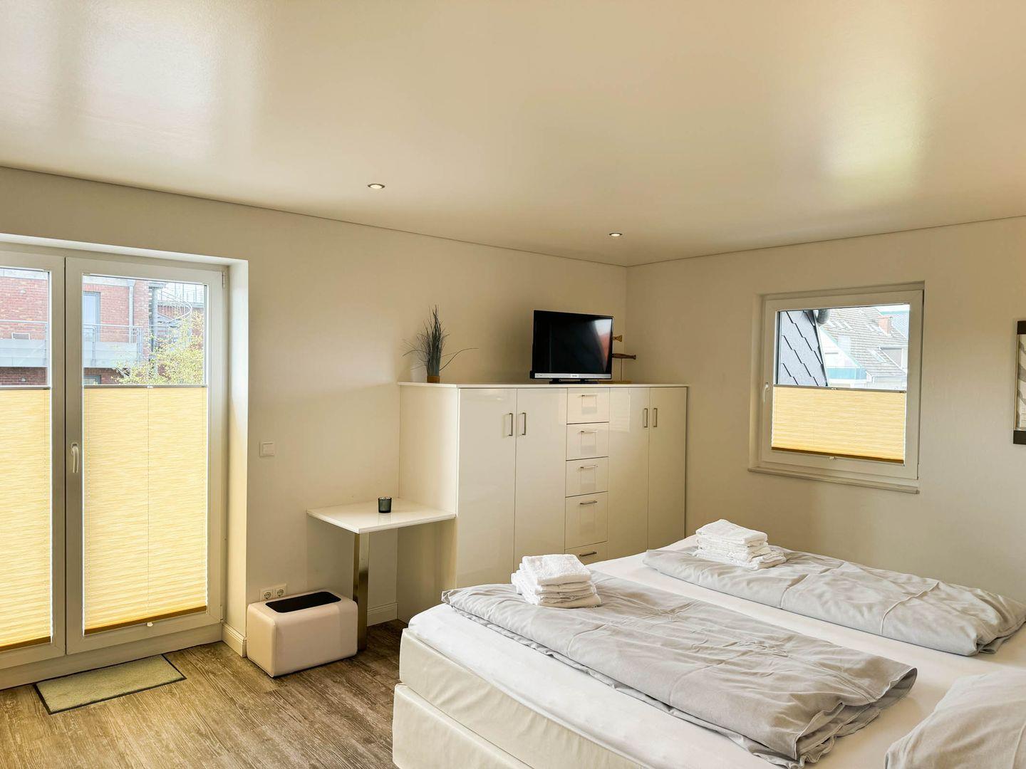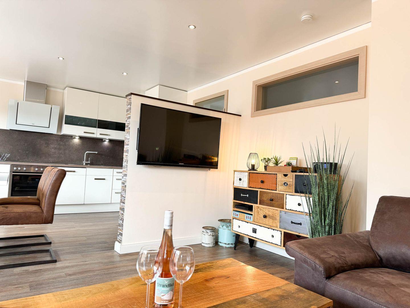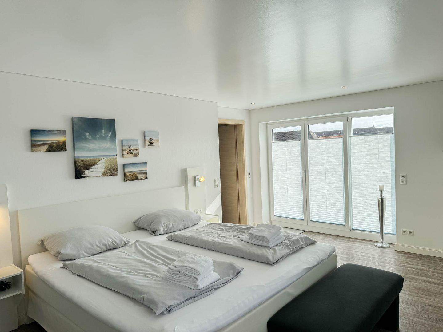 Dieses exklusive Penthouse-Appartement Nr. 5 hat eine Größe von 130 m² und befindet sich im Dachgeschoss des Hauses "Sand und Meer". Es verfügt über 2 großzügige Balkone. Das Haus hat auch einen Fahrstuhl, der Sie nicht nur in die Etage, sondern direkt in Ihr Appartement bringt. Im Wohnzimmer finden Sie eine gemütliche Couchgarnitur und einen Ohrensessel mit Hocker vor. Die Küche und der Essbereich sind im Wohnbereich integriert. Beide Schlafzimmer sind mit Boxspringbetten (Übergröße 2.00 x 2.20 m) und TV ausgestattet und verfügen über ihr eigenes Duschbad, welches direkt über das jeweilige Schlafzimmer zu erreichen ist. Beide Bäder sind mit barrierefreier, begehbarer Dusche (1x Duscheingangsbreite 70 cm, 1 x Duscheingangsbreite 77 cm) ausgestattet. Das Appartement verfügt zusätzlich über ein Gäste-WC in dem sich eine Waschmaschine und ein Trockner (Münzenautomat) befinden. Alle Türen haben eine Breite von 81,5 cm. Ein Abstellraum befindet im Appartement. Das Appartement ist mit Fußbodenheizung , elektrischen Außenjalousien und Markise ausgestattet. Vom Wohnzimmer und einem der Schlafzimmer gelangen Sie auf den großen Balkon, der im Südwesten liegt und einen Teilmeerblick hat. Den kleinen Balkon im Südosten erreichen Sie über das andere Schlafzimmer.