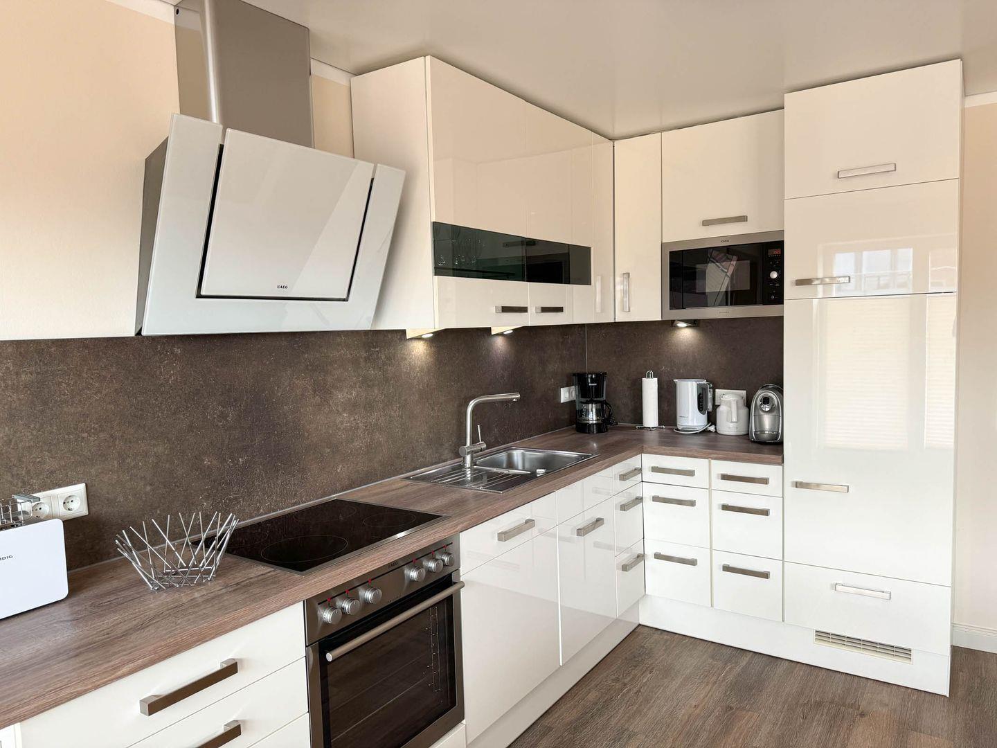 Küche: Backofen, Herd mit Cerankochfeld, Geschirrspüler, Mikrowelle, Kühlschrank mit Gefrierfach, Kaffeemaschine, Wasserkocher, Toaster