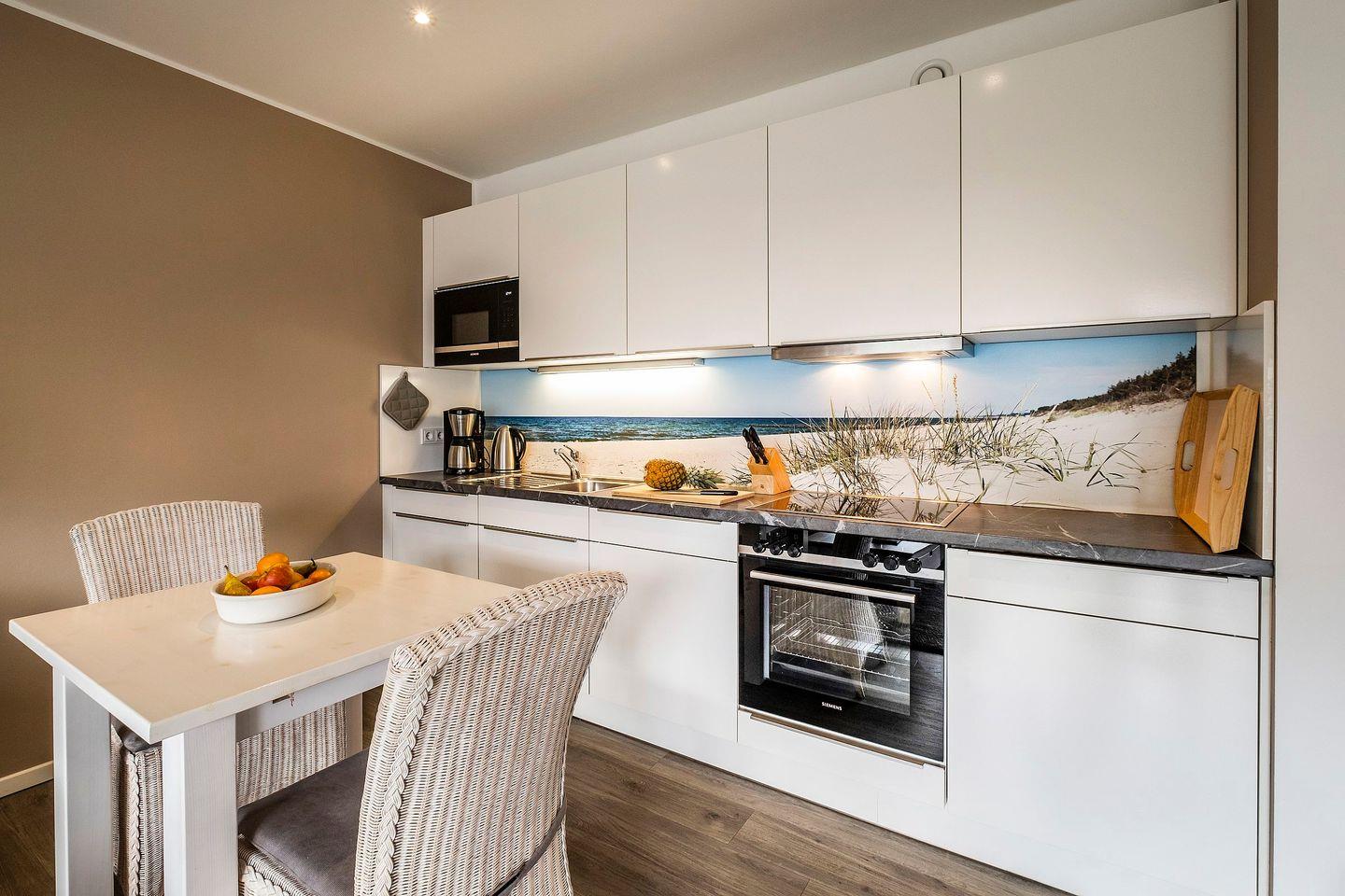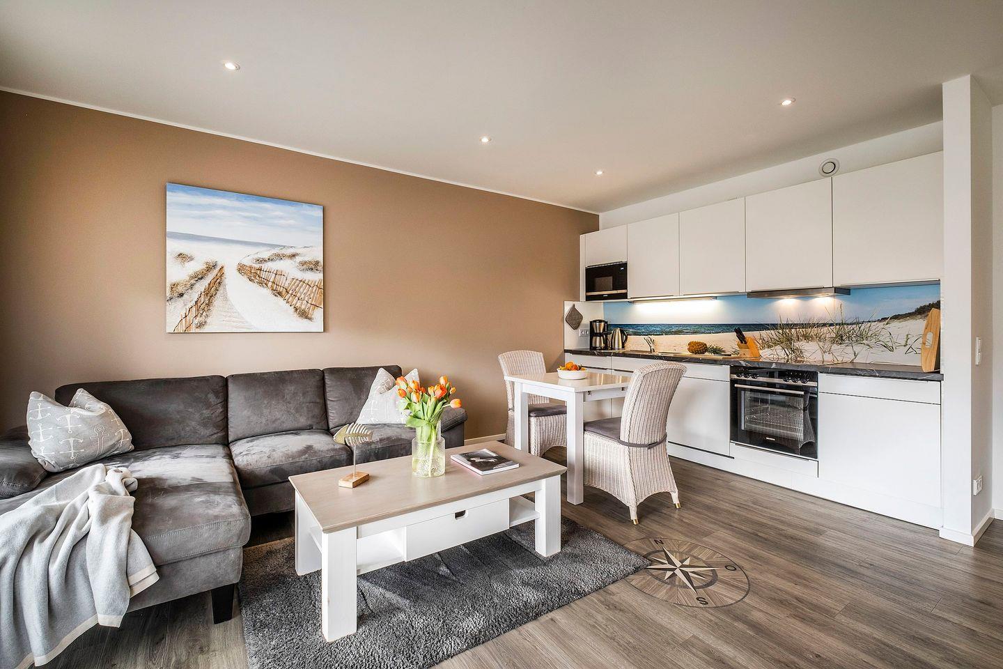 Nun gönnen Sie sich einen Schluck "Flaute" oder "Sturm" (Mineralwasser) & einen Happen "Marzipansprotten" und lassen Sie das maritim eingerichtete Wohnzimmer mit dem gemütlichen Sofa, der Schrankwand mit internetfähigem Fernseher, Blu-ray Player und HiFi-Anlage, der Essecke mit den bequemen Rattanstühlen und der offenen Kombüse mit den hochwertigen und zahlreichen Elektrogeräten sowie dem Blick auf das Bild „Nordsee“ auf sich wirken.