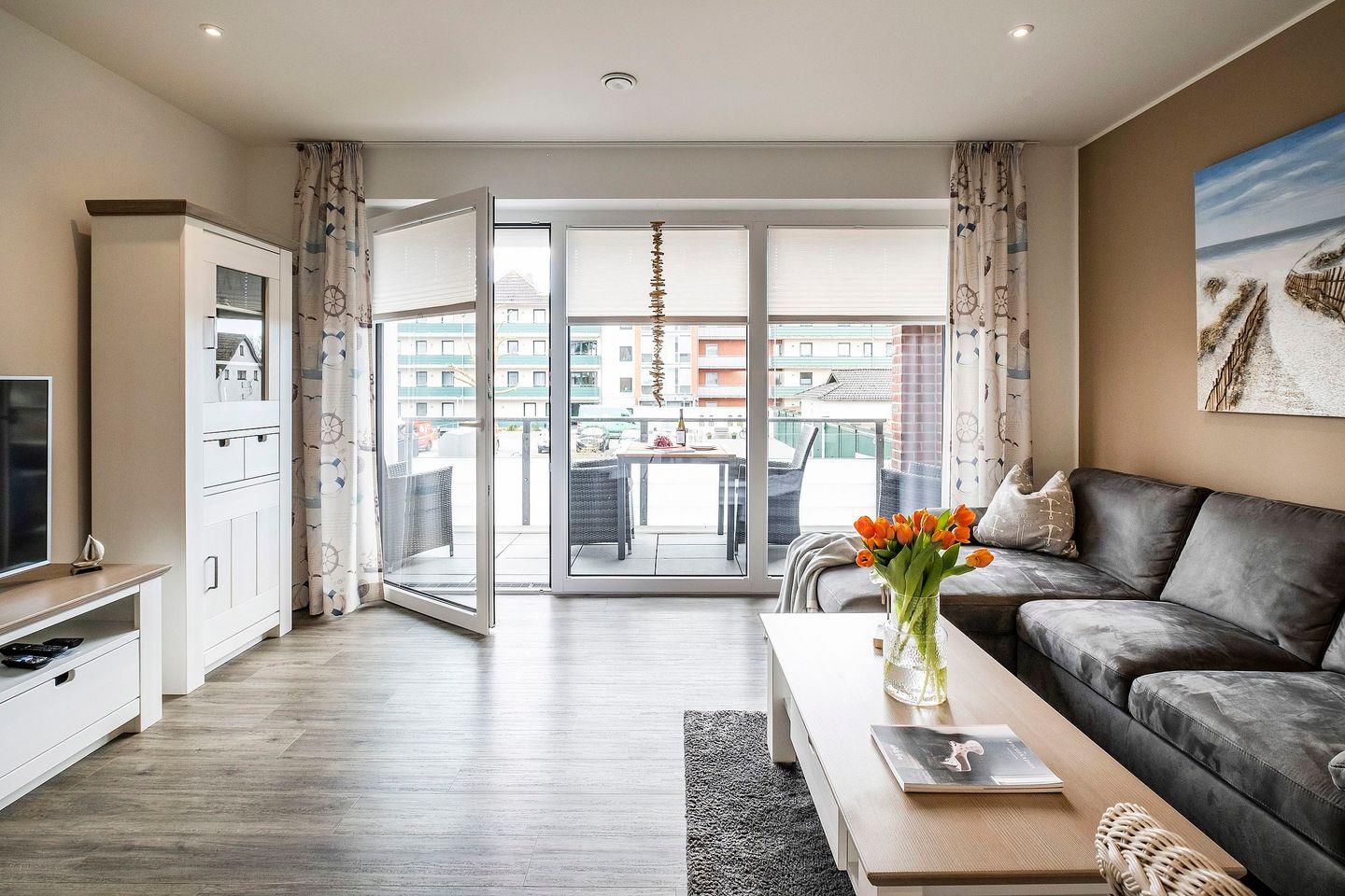 Entern Sie Ihre Kabine und stellen Sie Ihr Gepäck zunächst einfach beiseite, um vom Wohnzimmer oder südwestlichen Balkon aus den herrlichen Deichblick und die frische Brise zu genießen.