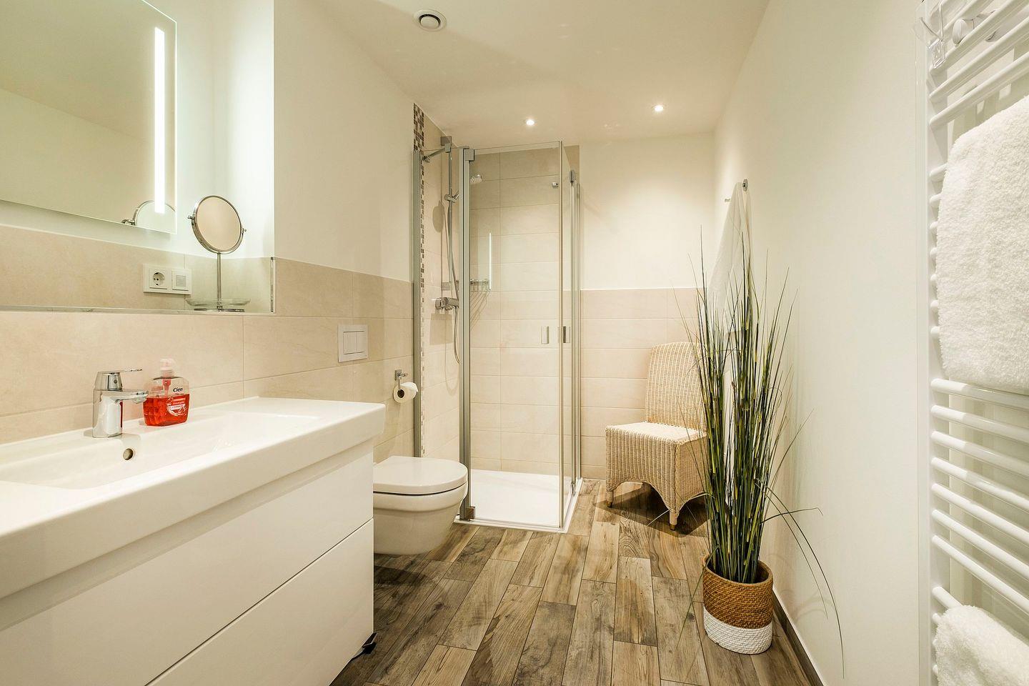 Sollten Sie wider Erwarten noch immer nicht bereit zum Genießen Ihres Aufenthaltes sein, begeben Sie sich ins geräumige Duschbad mit bodenebener Dusche, um sich dort bei norddeutscher Radiomusik frisch zu machen.