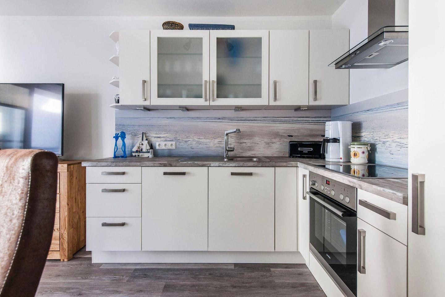 Küchenzeile: Geschirrspüler, Cerankochfeld, Mikrowelle, Backofen, Kühlschrank mit Gefrierfach.