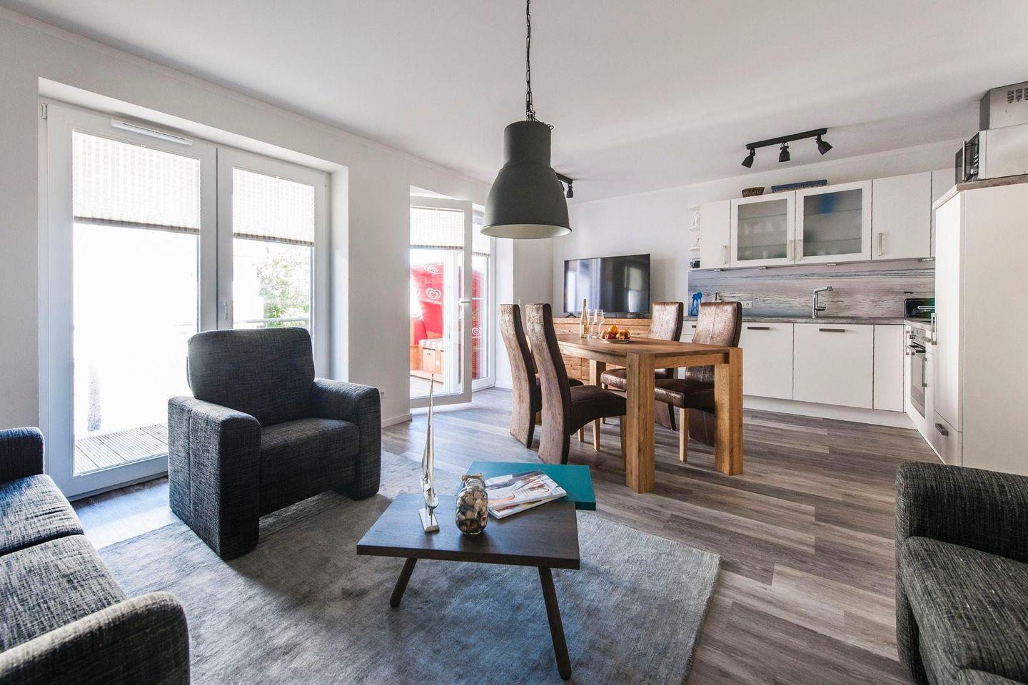 Die Ferienwohnung 1.3 ist eine moderne 2-Raum-Wohnung mit Balkon. Die Küchenzeile und der Essbereich sind direkt im Wohnbereich integriert. Das Bad verfügt über eine ebenerdige Dusche, WC, Handtuchtrockner und Haar-Föhn. Vom Wohnbereich gelangen Sie direkt auf den Balkon.