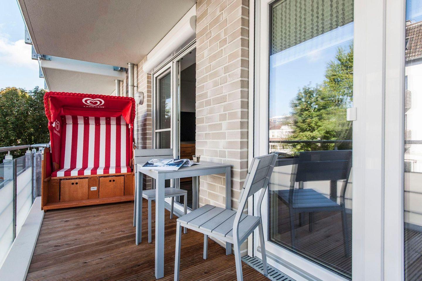 Balkon: Westlage mit Balkonmöbeln und Strandkorb, Insektenschutz an der Balkontür