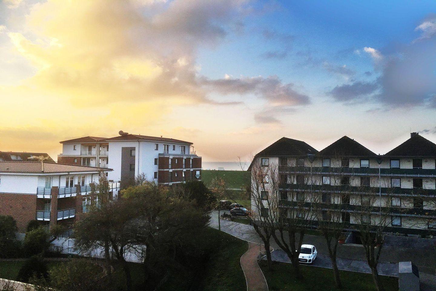 Der überdachte Balkon mit Markise und Gartenmöbeln lädt dazu ein, den Blick auf das Wattenmeer zu genießen und draußen zu entspannen. Für ein angenehmes Raumklima sorgt die Fußbodenheizung, ergänzt durch eine moderne Heizanlage. Allergikerfreundliche Ausstattung ist ebenso vorhanden wie ein Safe für Ihre Wertsachen. Im Haus stehen Ihnen Gemeinschaftsangebote wie ein Fitnessraum, eine Sauna und ein gemeinschaftlich nutzbarer Waschraum mit Waschmaschine und Trockner zur Verfügung. Ihr Fahrzeug parken Sie bequem auf einem privaten PKW-Stellplatz direkt am Haus. Ein großer, abschließbarer Fahrradraum befindet sich direkt neben dem Eingang zum Haus, ideal für das Mitbringen eigener Fahrräder.