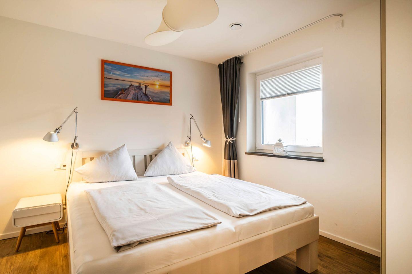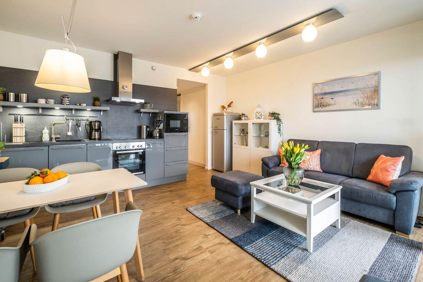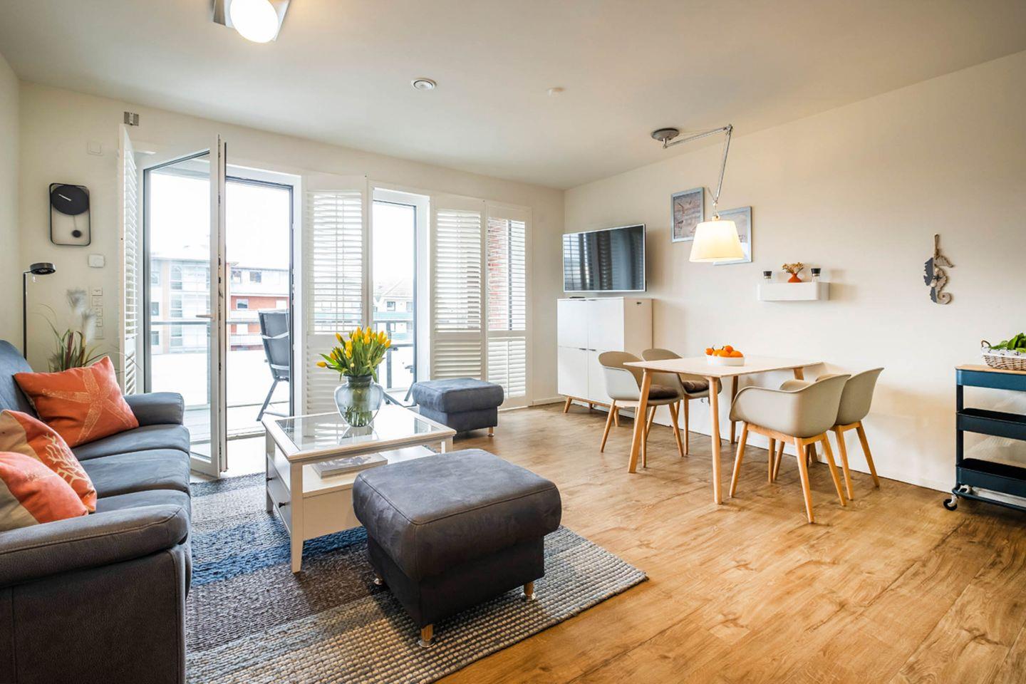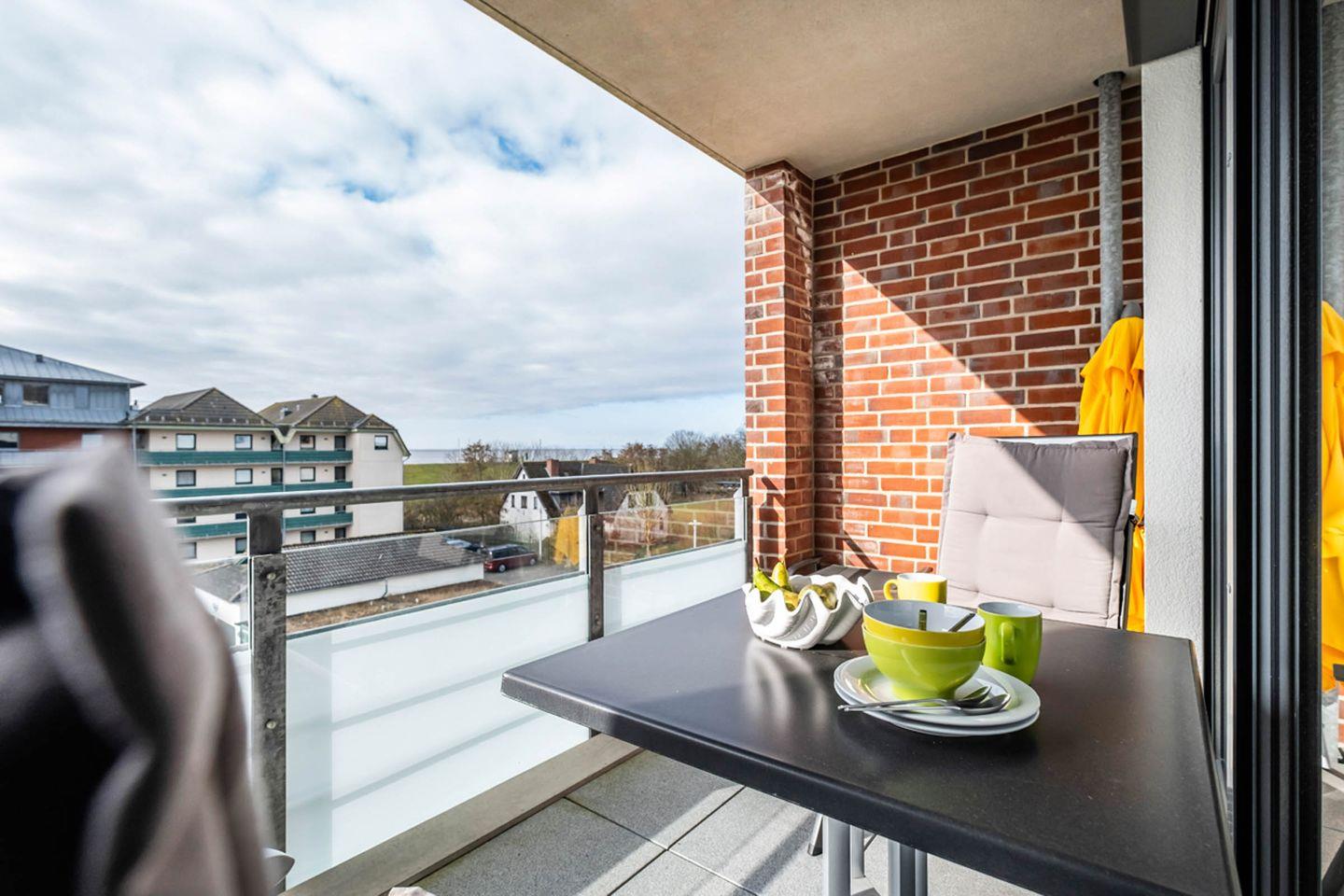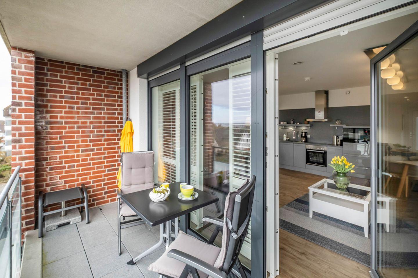 Das modern ausgestattete Apartment im Haus Strandläufer bietet auf 55 m² mit Meerblick einen komfortablen Rückzugsort für zwei Personen. Es verfügt über einen Balkon, eine offene Küche, Fußbodenheizung, WLAN sowie Zugang zu Sauna und Fitnessraum im Haus. Die zentrale Lage nur 250 m vom Strand und Einkaufsmöglichkeiten entfernt, ein Aufzug sowie ein Privatparkplatz runden das Angebot ab.