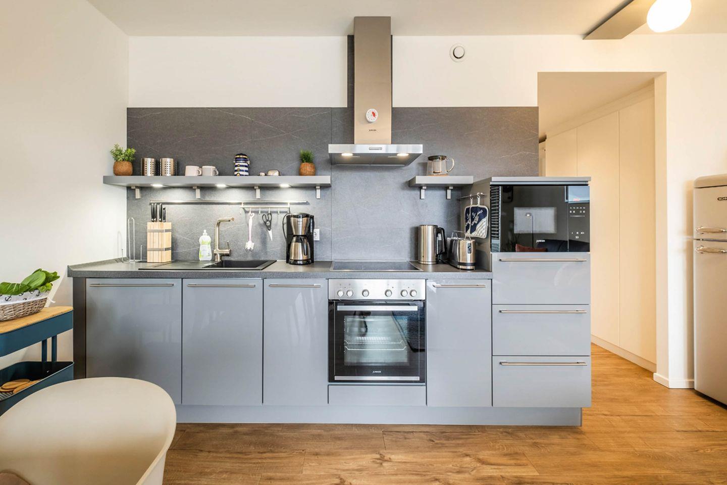 Küche: Backofen, Cerankochfeld, Mikrowelle, Geschirrspüler, Kühl- Gefrierkombination, Kaffeemaschine, Wasserkocher, Toaster
