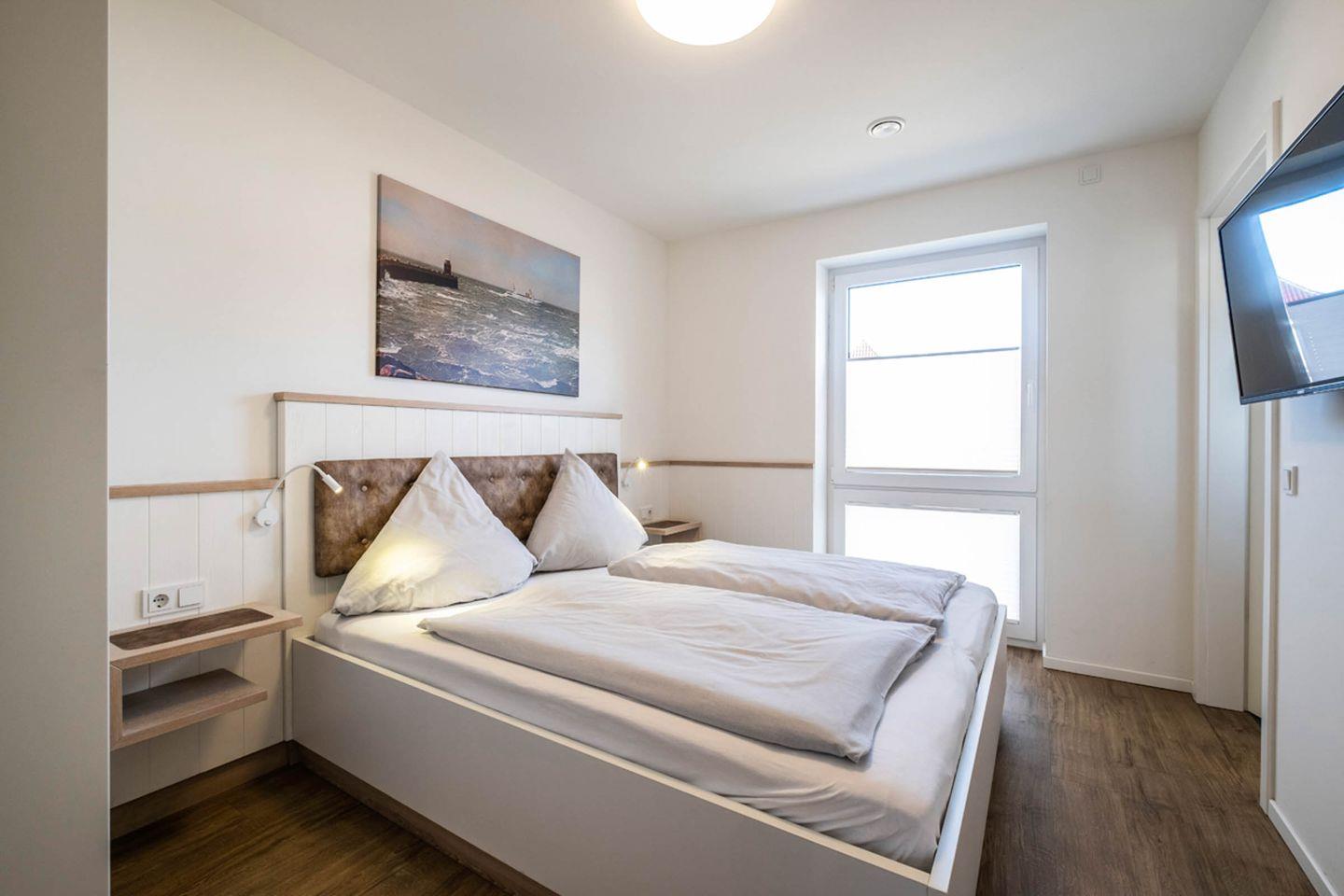 Das Appartement 1.6 (Deich Lounge) ist ein großzügig geschnittenes Appartement mit 2 Schlafzimmern (ausgestattet mit jeweils Doppelbett und Fernsehgerät) und 2 kompletten Duschbädern. Eins der Duschbäder ist en-Suite. Die Wohnung ist modern, gemütlich und liebevoll eingerichtet. Dem Appartement ist ein PKW- Stellplatz direkt am Haus zugehörig. Ein Fahrradraum, der abschließbar ist, befindet sich am Haus.